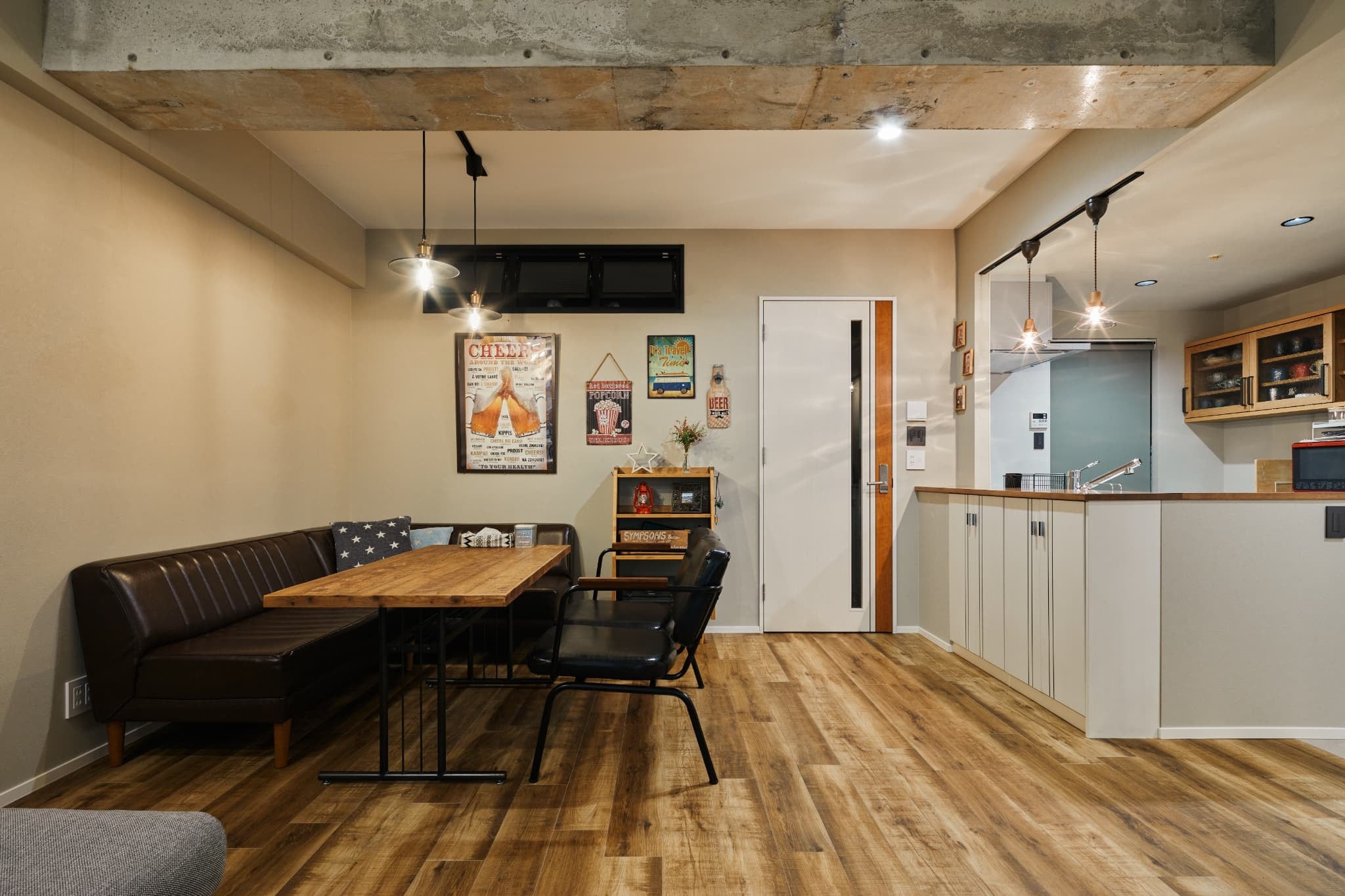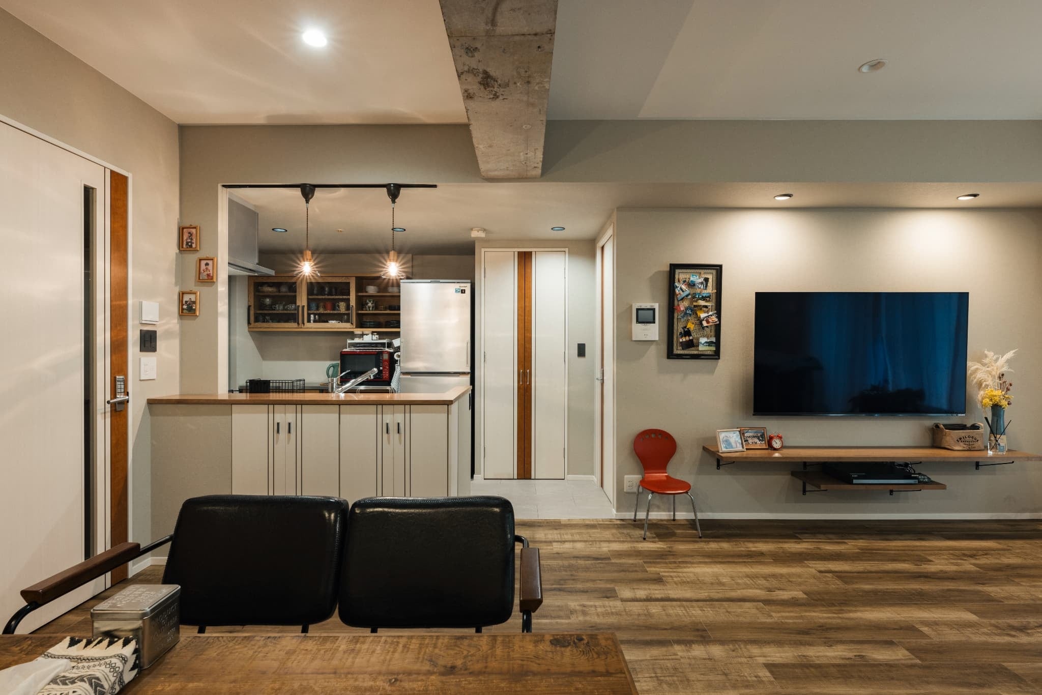 リビングに隣接した和室を撤去し、広さを確保したリビング。ベースの壁紙の色味を白からベージュ系に変更し、梁だけをコンクリート現しにすることで、LDK全体の雰囲気を大きく変えています。