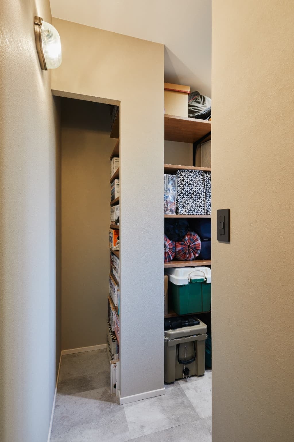 もともと洋室だったスペースの一部を利用し、新たに玄関土間を設けました。漫画を集めることが趣味の施主様のために置いた奥行きが深い本棚は、省スペースながらも抜群の収納力です。
