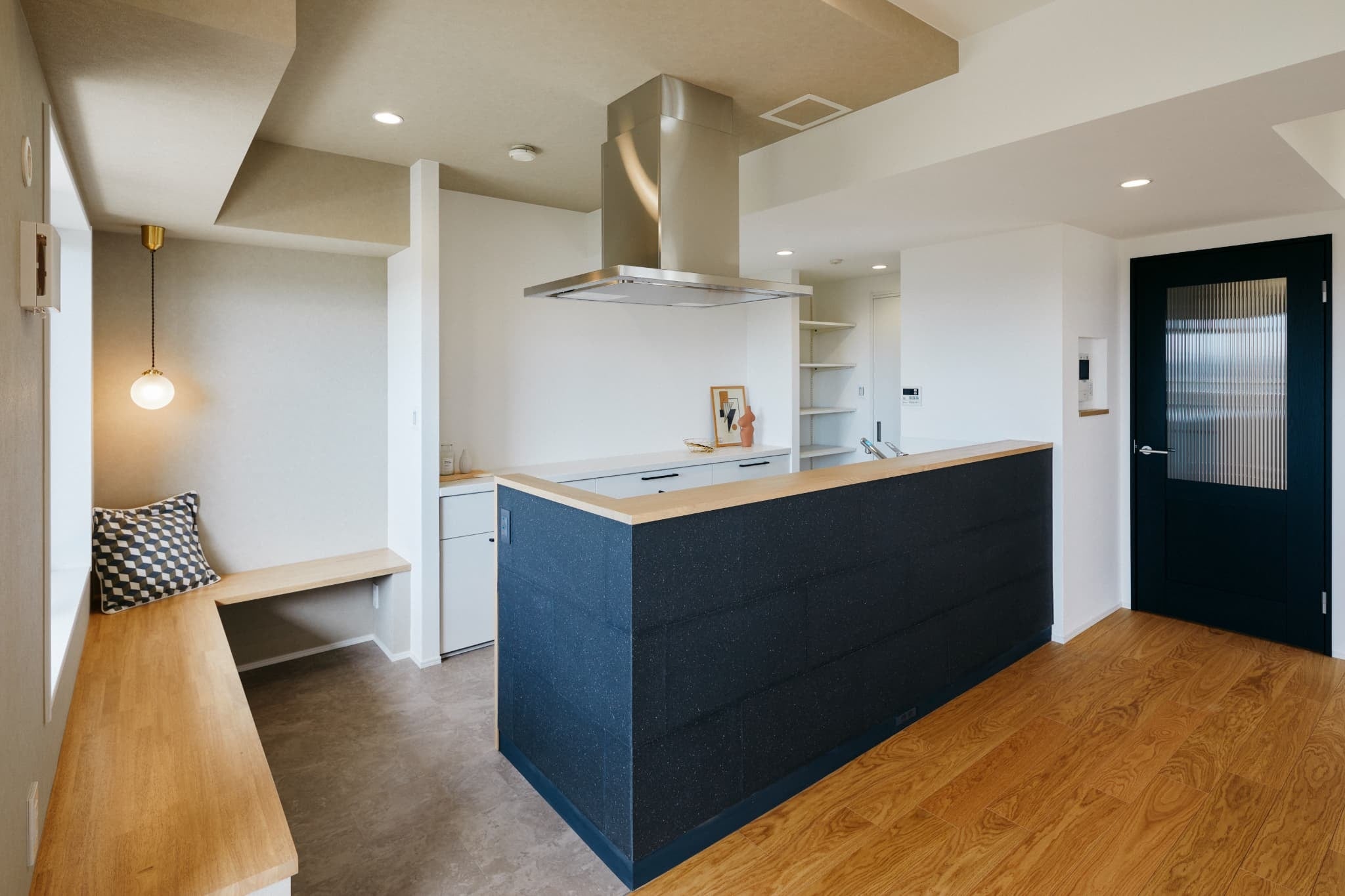 窓際にベンチを製作し、家事の合間に一息つけるようなヌックスペースを設けました。ベンチ下に料理本を置いたり、収納ボックスを置けばパントリーとしても利用可能です。