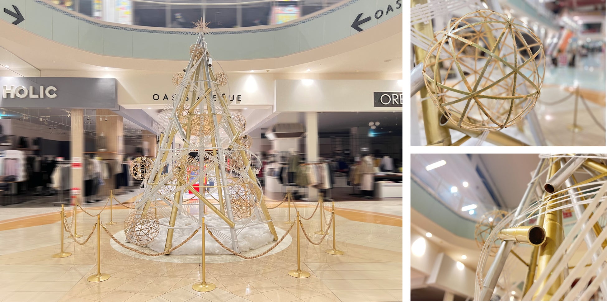 竹ツリーに使用される竹は一本一本が地元の自然から生まれた命ある素材。その美しさを活かすため、自然な質感を残しながらクリスマスらしいきらめきと調和するように設計・装飾を行いました。竹の直線と竹筋のアーチを生かし、オーナメントには竹ツリーのために制作した竹ボールを飾り、温かみと静けさを感じる存在感のあるツリーがお客様を迎えます。さらに、素材の背景や再利用の意義を伝える説明パネルも併設し、来館されるお客様に考えるきっかけとなる仕掛けを盛り込んでいます。