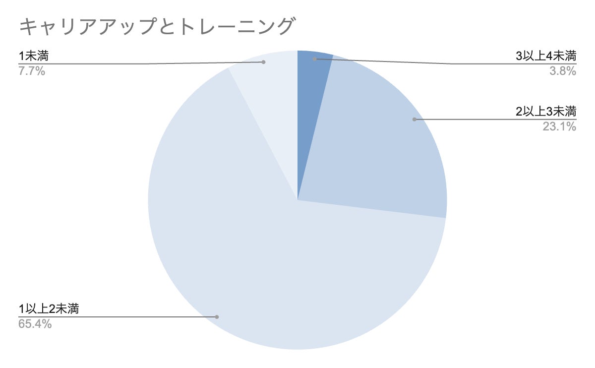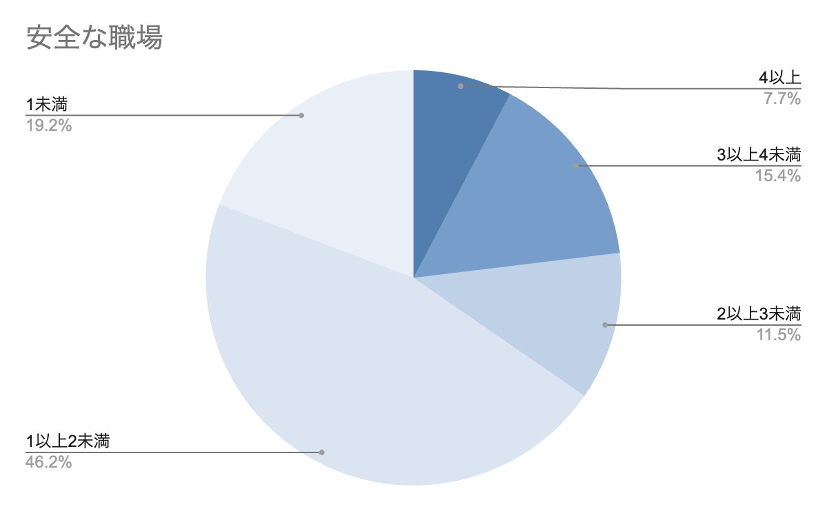 ◾️「キャリアアップとトレーニング」、「安全な職場」の指標は1以上2未満が大きく割合を占めており、ほとんどの企業が何かしらの制度や研修を設けている
