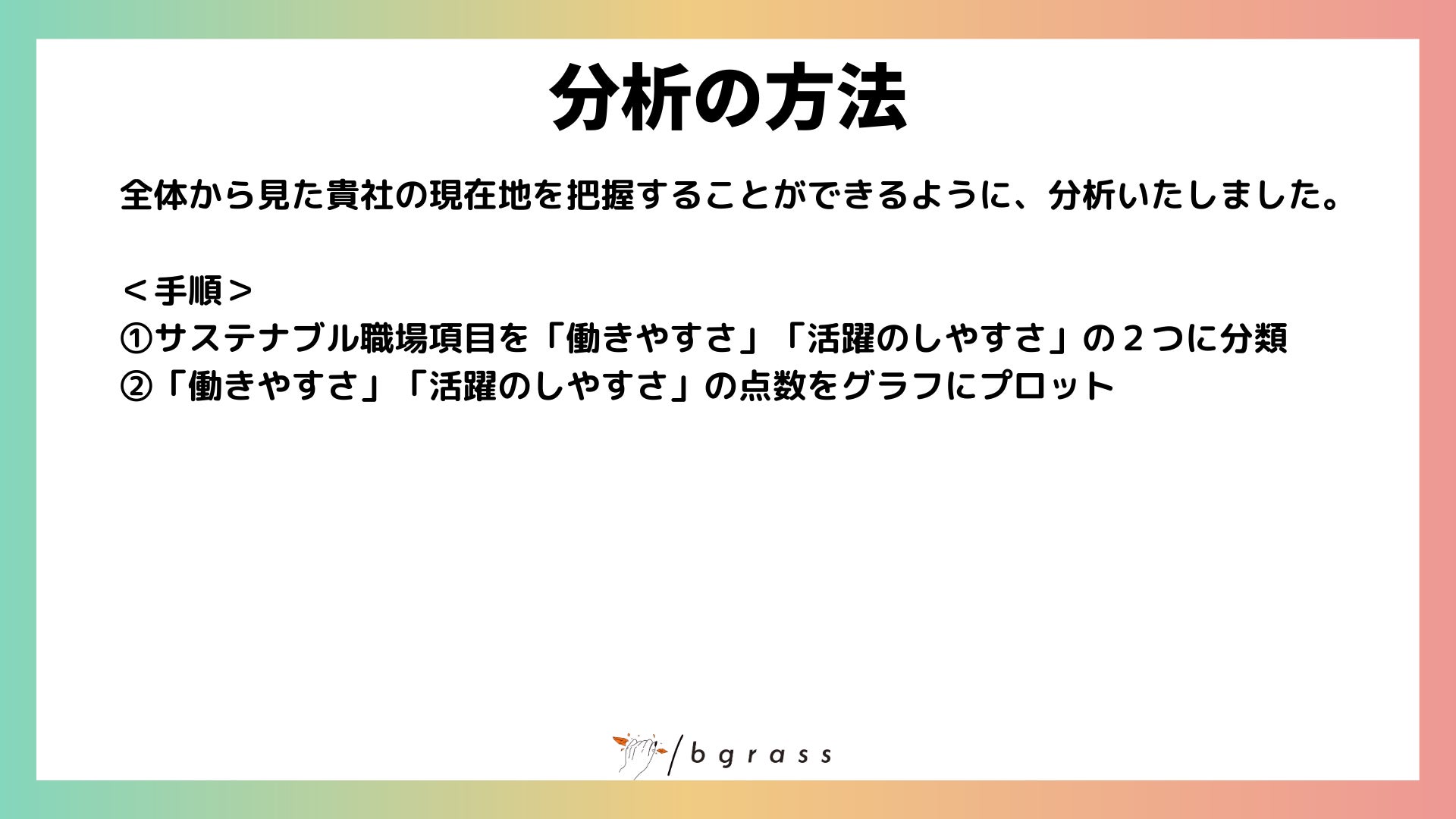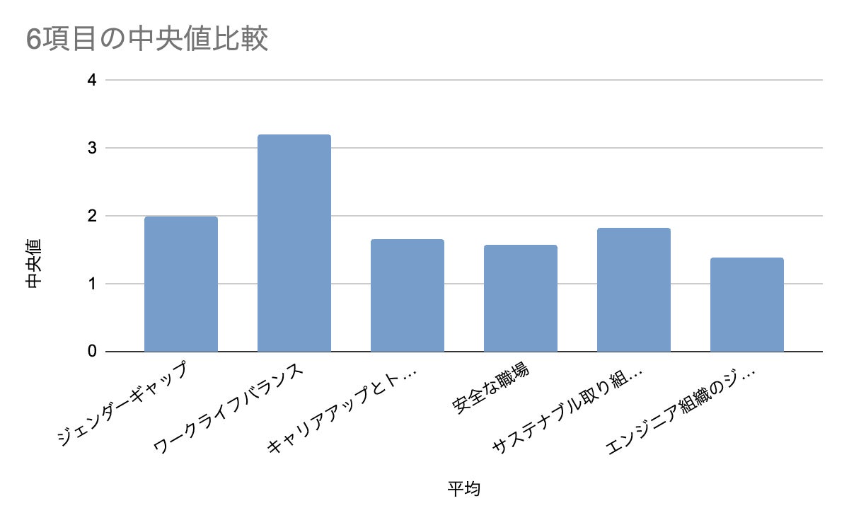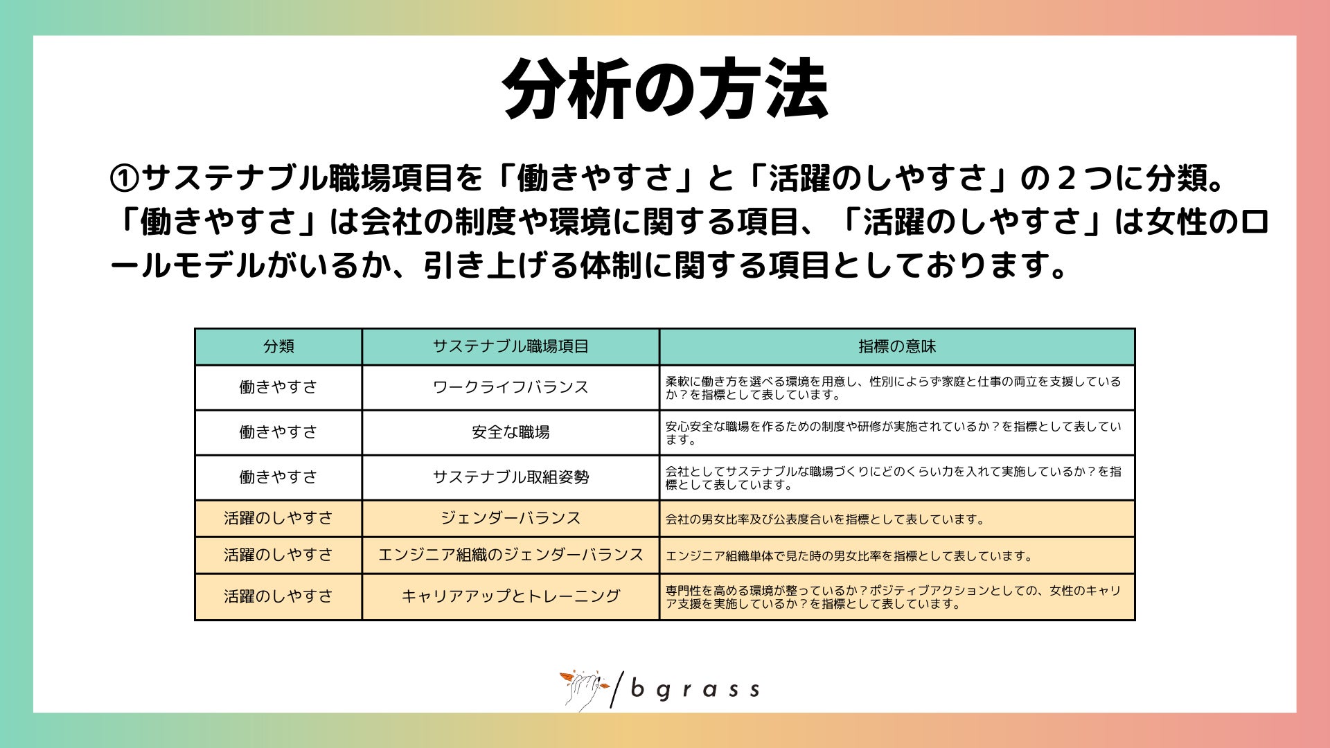 サステナブル職場診断結果の6項目「ジェンダーバランス」「ワークライフバランス」「キャリアアップとトレーニング」「安全な職場」「サステナブル取組み姿勢」「エンジニア組織のジェンダーバランス」の指標別調査と企業タイプを分析することで、企業傾向を調査する。