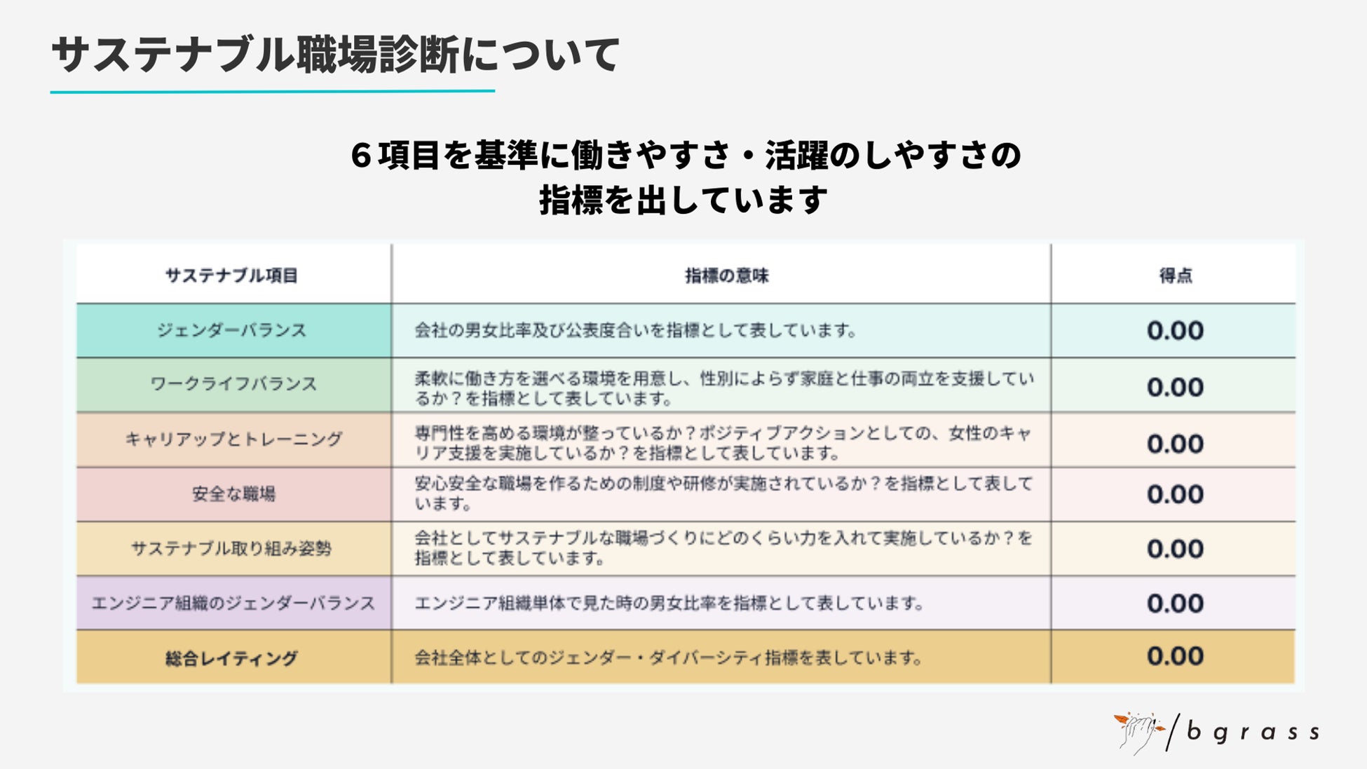 はじめに、現在の日本企業だと、ほとんどの企業が指標が低くなってしまう傾向にある。冒頭でも伝えた通り、「サステナブル職場診断」はグローバルスタンダードなジェンダースコアカード「WEPs」を元にしているためである。指標は0〜5で結果が出るようになっており、現在の日本だと、2以上の指標があれば、取り組みを実際に行っていたり、これから実施する意欲のある企業であり、現状に課題を持ち実際にアクションを起こしている企業だと認識していただきたい。今後、徐々に日本やIT業界自体が変わり、数年かけて5に近づいていくことを信じて、指標を設計している。