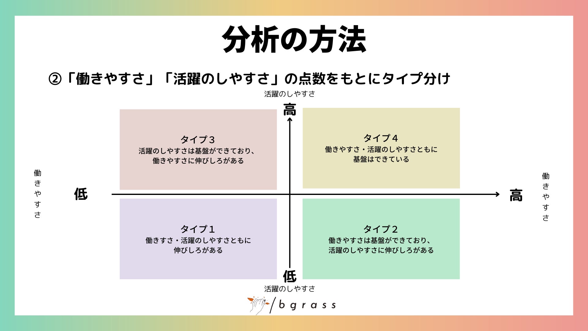 診断結果をもとにした企業環境の可視化のみならず、現状分析とネクストステップまでわかるようになっております。現状分析は、4象限のうちどのタイプかを見ることで、企業環境の傾向とそれに伴うアクションを提示しています。