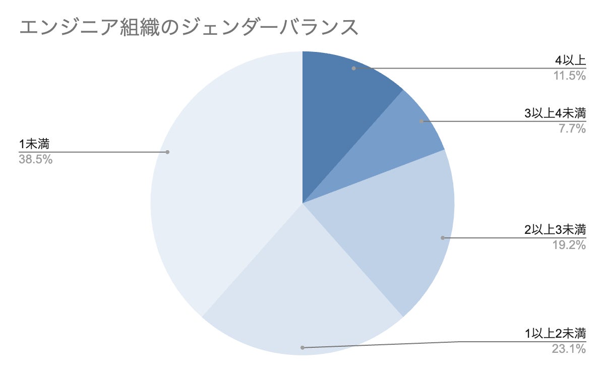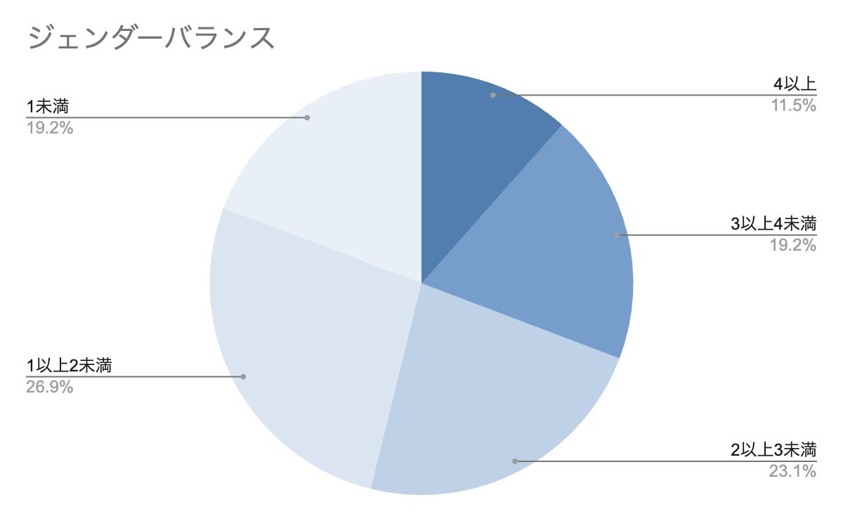 組織のジェンダーバランスは管理職の女性比率に課題はあるが、従業員の女性比率が高い企業もあり、指標2以上の企業は50%以上となっている。一方でエンジニア組織のジェンダーギャップの指標は1未満が最も多く、IT業界のジェンダーギャップの課題が可視化されている。しかし、指標が4以上の企業も11.5%いるため、しっかり取り組みを実施できている企業は女性エンジニア比率も高いことがわかる。