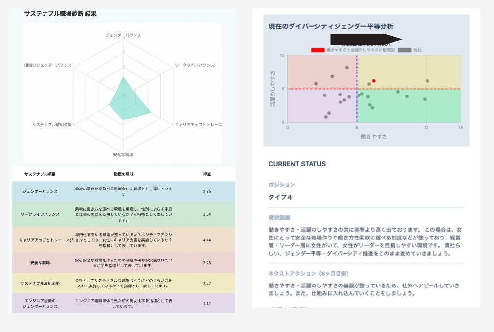 この「サステナブル職場診断」はグローバルスタンダードなジェンダースコアカード「WEPs」をベースとして作った診断です。診断を実施すると、6項目「ジェンダーバランス」「ワークライフバランス」「キャリアアップとトレーニング」「安全な職場」「サステナブル取組み姿勢」「エンジニア組織のジェンダーバランス」で指標を図ることができ、自社にとってどのポイントが強みで、どのポイントに取り組んでいくべきなのかが一目でわかるようになっています。