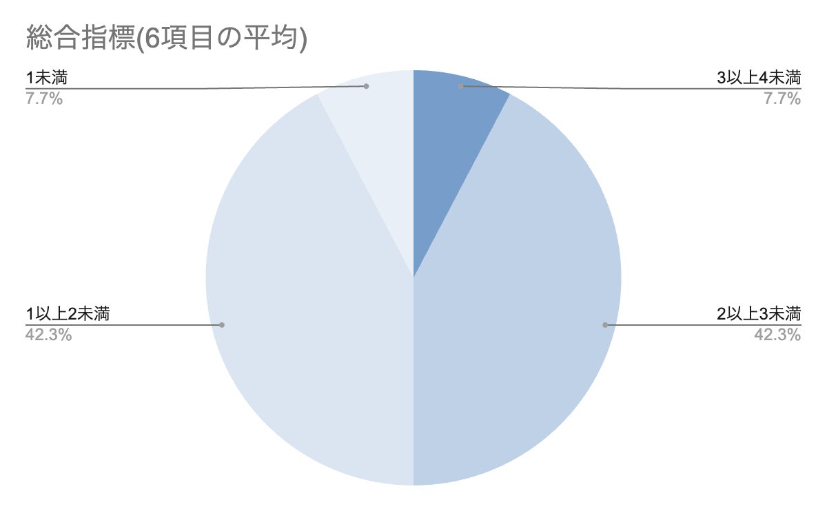 企業の総合平均の割合は1以上2未満が42.3%、2以上3未満も同様に42.3%と大きく割合を占めており、ジェンダーダイバーシティの取り組みはグローバル水準からは低い企業が多い傾向にある。一方で3以上4未満の企業は7.7%ではあるが、取り組みに積極的な企業も見られる