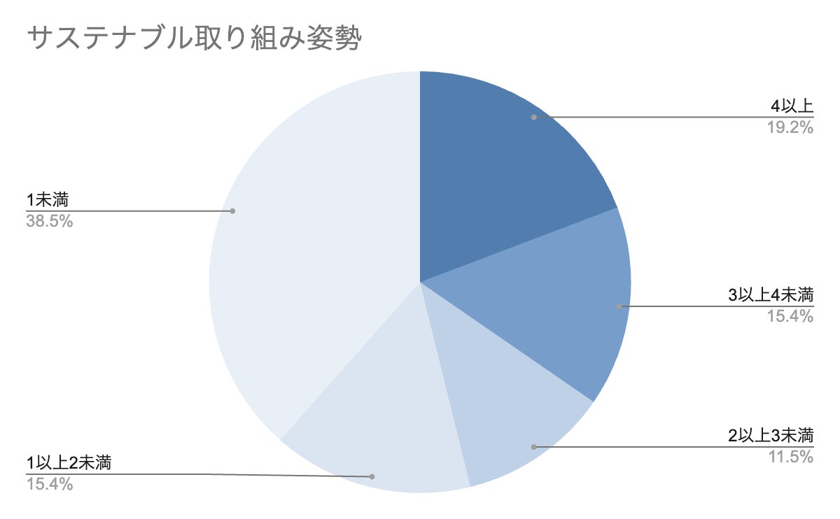 ◾️サステナブル取り組み姿勢の指標は1未満の企業も多いが指標が4以上の企業も19.2%おり、経営レベルから取り組みを実施している企業も増えている