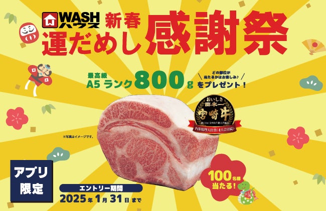 WASHハウスアプリ会員様を対象にした宮崎牛最高級A5ランク800gが抽選で100名様に当たる新春運試し感謝祭プレゼントキャンペーンを開催いたします。