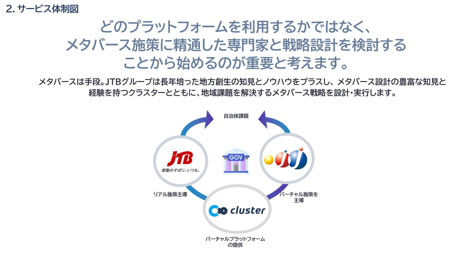 株式会社JTB(以下、JTB)と株式会社ジェーシービーの合弁会社である株式会社J&J事業創造(以下、J&J)は、クラスター株式会社(以下、クラスター)との共創により、全国の自治体が直面する人口減少や交流人口の拡大といった課題に対し、新たな解決策となる「ジチタイメタバース(※商標出願中)」のサービスを2025年10月23日に開始します。本サービスは、本サービスは、地域課題の解決と新しい価値の創造を目指し、JTBが各自治体への営業推進に連携します。