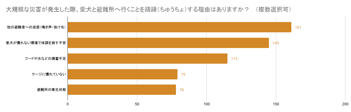 「他の避難者への迷惑(鳴き声・抜け毛など)」が最多となり、飼い主の周囲への配慮が避難の心理的障壁となっていることが分かりました。