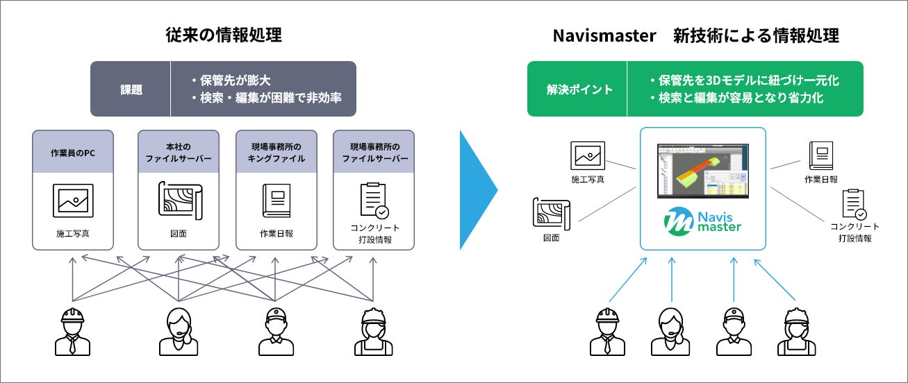 従来は施工写真、図面、作業日報などの施工管理に関する情報が紙や電子など複数のフォーマットや形式で保管されていました。Navismasterを利用することで、それらの情報を3Dモデルに集約し一元管理することが可能となります。