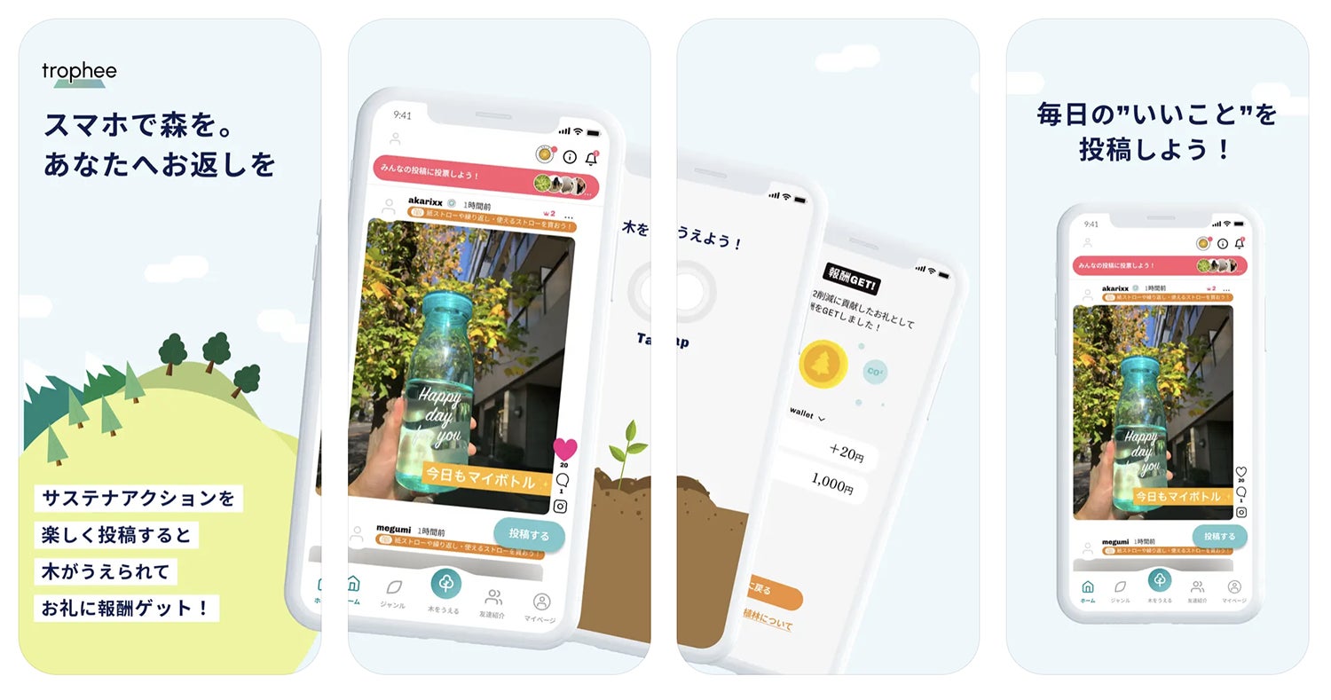 「trophee」は、日常のサステナブルなアクション(マイボトルの持参、見切り品の購入、節電など)をアプリ内に投稿する仕組みで、個人がサステナブルに過ごす毎日を育み応援しあう実践型サステナビリティプラットフォームです。アプリ内にサステナブルなアクションを投稿することで、「木をうえる」ことができ、その報酬として植林1本あたりにつきポイントが貰えるサービスのほか、サステナビリティについて知識を深めるコンテンツも提供しています。身近なサステナアクションで、環境や生物多様性の保護など社会課題に貢献できる、”ちょっと地球にいいことを”実現するサービスです。