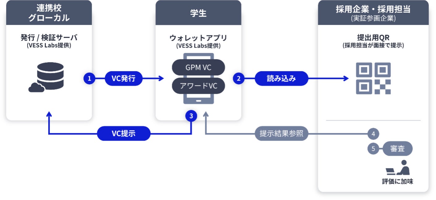 特定非営利活動法人グローカル人材開発センター(注1、以下 グローカル)、株式会社VESS Labs(ベスラボズ、注2)、日本電気株式会社(注3、以下 NEC)は、文部科学省大学間連携共同教育推進事業「産学公連携によるグローカル人材の育成と地域資格制度の開発」 (注4、以下 推進事業連携校)と連携し、分散型ID技術(注5、以下 DID)を活用した「検証可能な資格証明」(注6、以下 VC)を利用し、京都における人材循環モデルを共同で構築します。