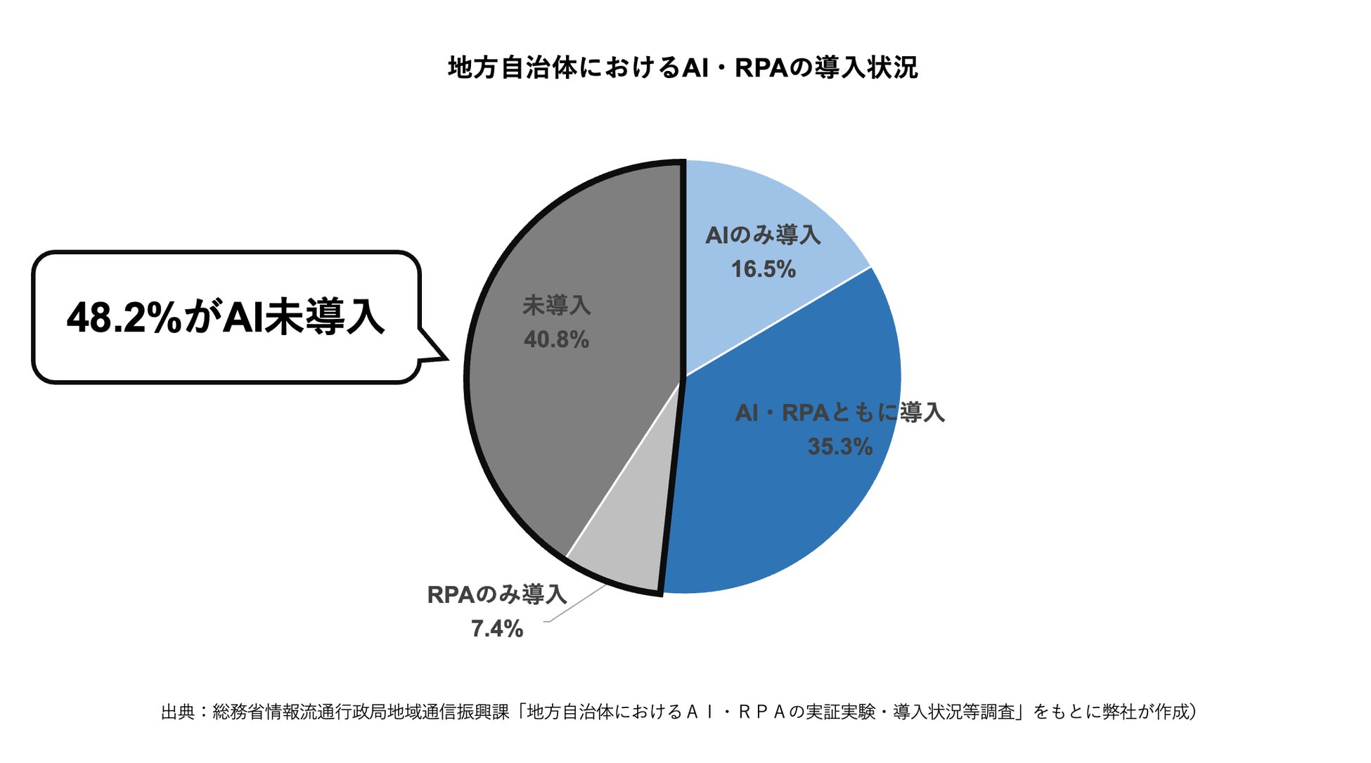 少子化が進み人材不足が課題となるなか、自治体もAI導入による省人化が急務となっています。しかし、自治体は予算、人材などの制約が多く、AI導入を進めることが難しい環境に置かれており、地⽅自治体におけるAI導入(チャットボット、音声/文字認識含む)は、約半数程度にとどまっています。