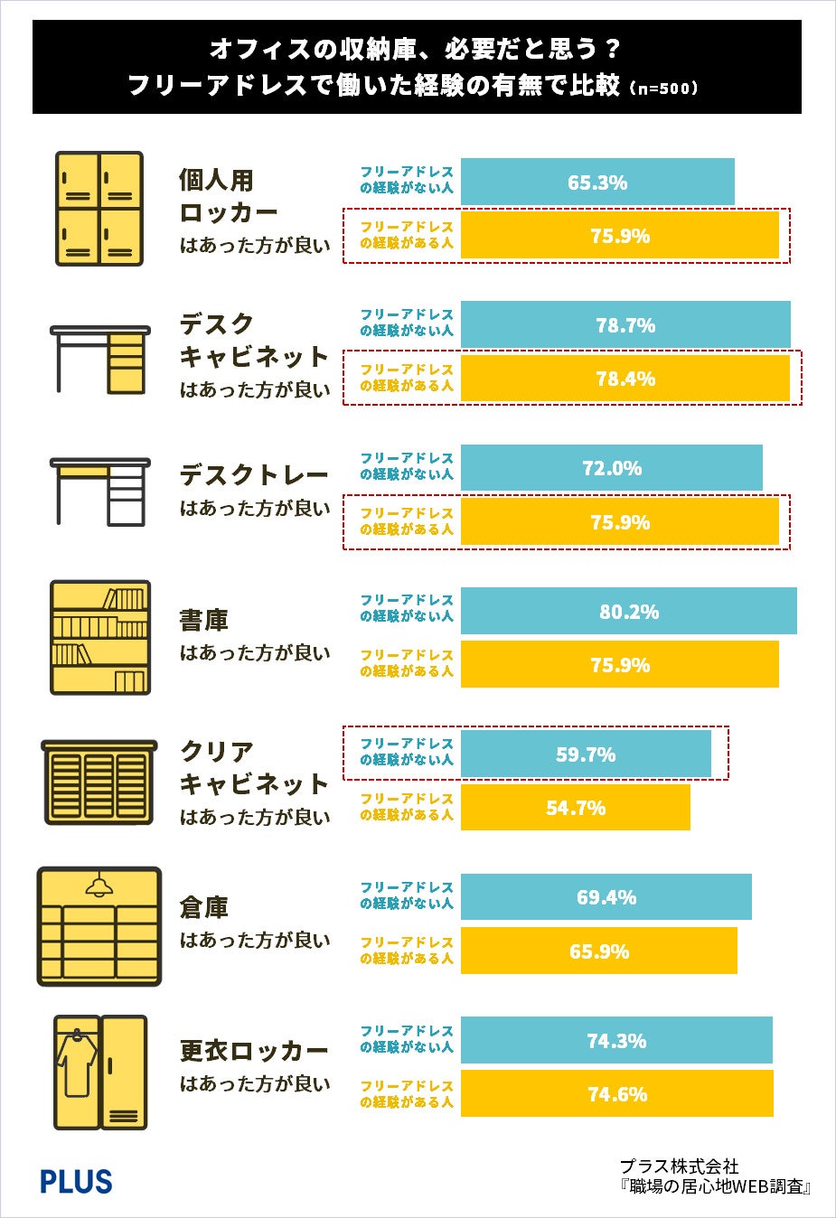 フリーアドレス制のオフィスで働いた経験がある人は、「個人用ロッカー」の必要性を強く感じているようですね。