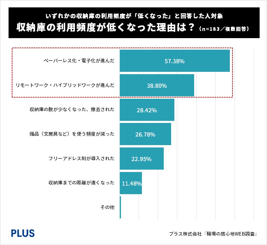 次に、いずれかの収納庫の利用頻度が「低くなった」と回答した183名を対象に理由を尋ねたところ、約4割以上の人が「ペーパーレス化・電子化が進んだから」「リモートワーク・ハイブリッドワークが進んだから」と回答しました。