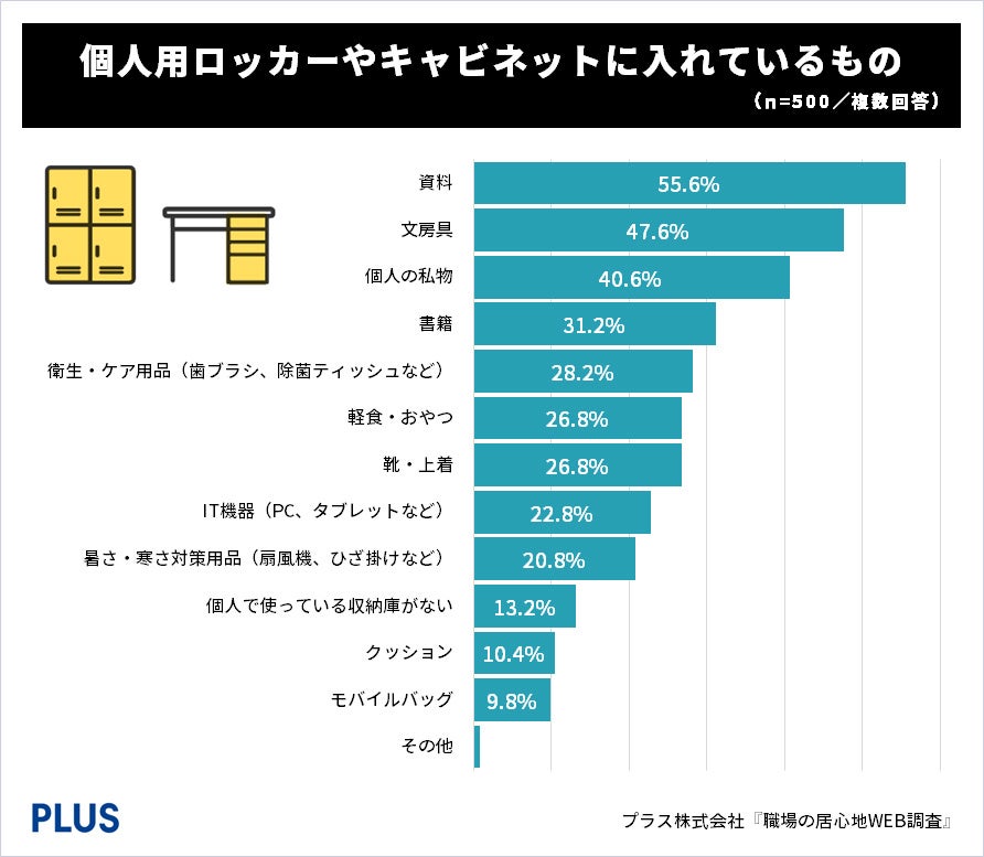 続いて、ロッカーやキャビネットなど個人で保管・管理する収納庫に入れているものを具体的に尋ねたところ、「資料」が55.6%で最も高く、次に「文房具」47.6%、「個人の私物」40.6%、「書籍」31.2%と続きました。