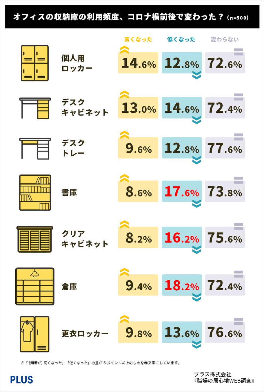 はじめに、オフィスにある主な収納庫の種類を取り上げ「コロナ禍前後で利用頻度に変化があったか」を尋ねました。「(頻度が)高くなった」と「低くなった」の差が5ポイント以上ある項目を赤文字としています。