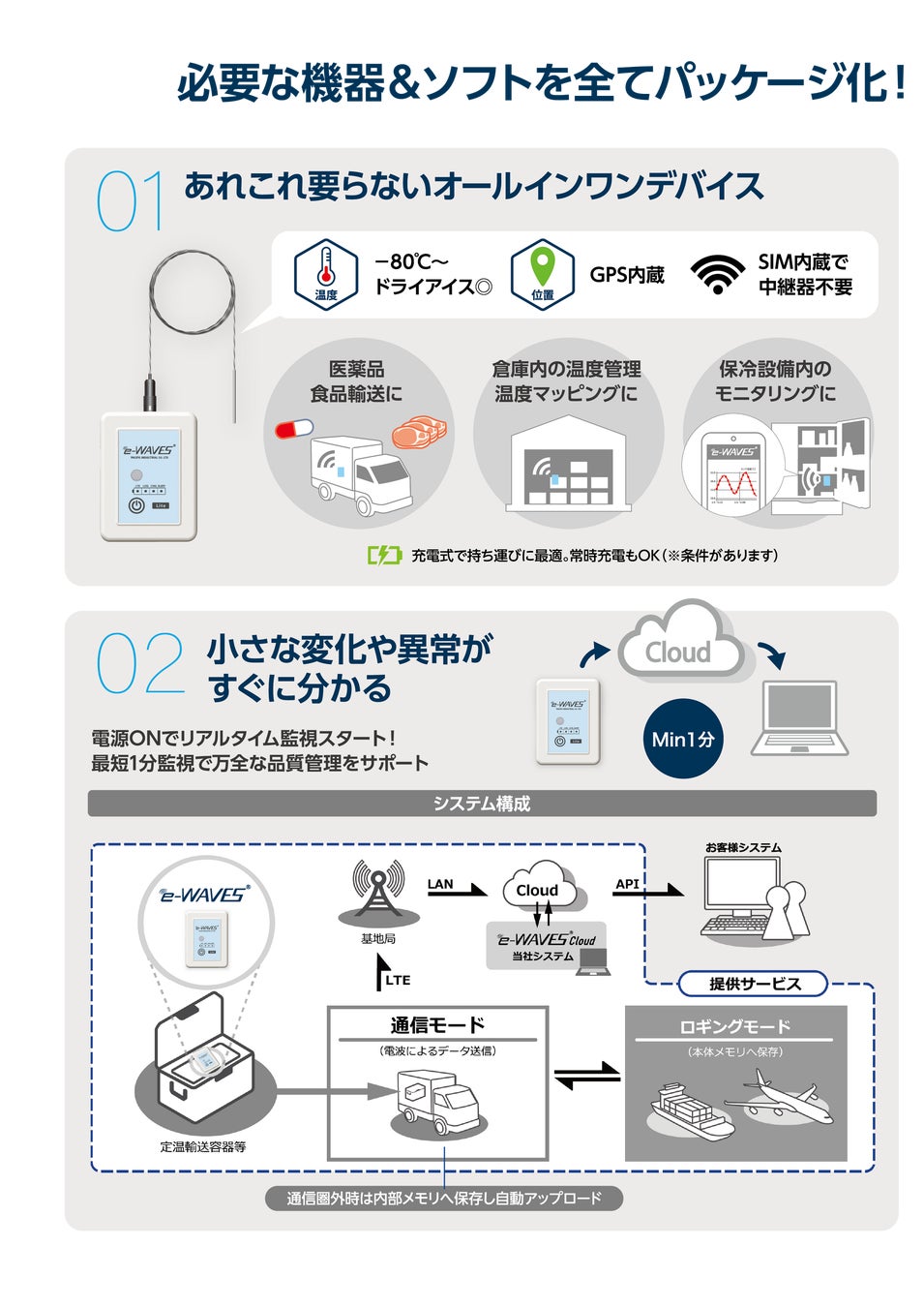 「e-WAVES」はデバイスとソフト(Webシステム)を全て標準でパッケージ化しており、社内インフラやソフトの準備がなくても、温度をリアルタイムに管理できます。