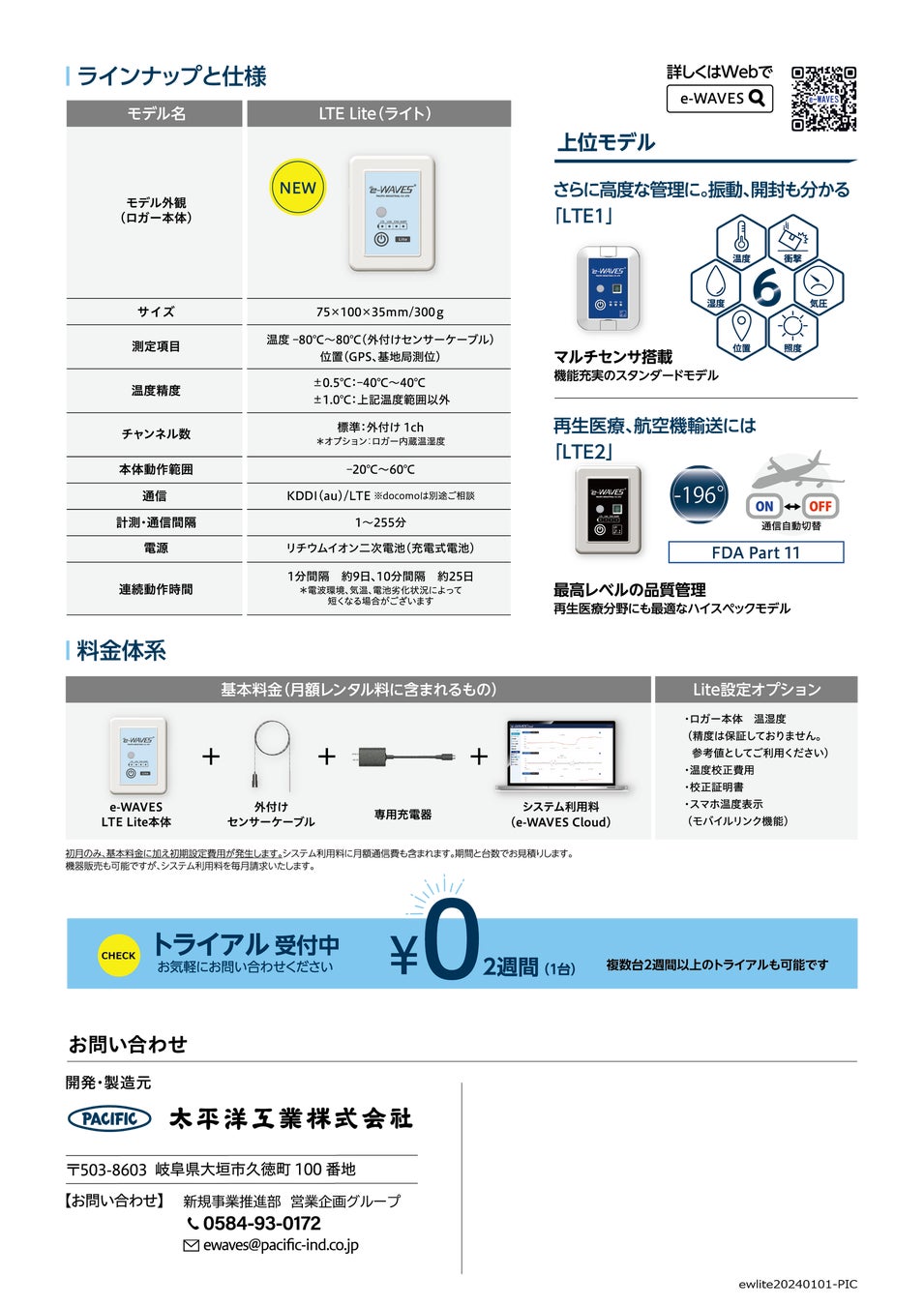 太平洋工業株式会社(本社:岐阜県大垣市、代表:小川 哲史)が展開する温度ロガー「e-WAVES」のラインナップとして、コストと機能を抑えた新モデルを24年1月にリリースいたします。