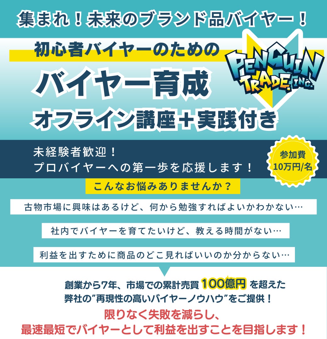 2024年12月1日、株式会社ペンギントレード(本社:東京都渋谷区宇田川町3-5 Spark SHIBUYA 6階、代表取締役:佐藤佑一)は、ブランド品バイヤーをこれから目指す方のための短期集中型講座を提供開始いたします。この講座は、初心者向けに構成されたカリキュラムであり、古物市場とは何か?から、業界構造の理解、相場表の見方、商品瑕疵の見極め方などを体系的に学べる参加型講義で、独学では得られないスキルと知識を実戦的に身につけることができます。詳細やお申込みについては、公式LINEでお問い合わせください。