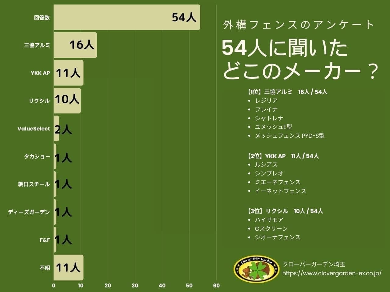 最近の調査結果によると、54人の回答者の中で、最も人気のある外構フェンスメーカーは三協アルミであり、約29.6%にあたる16人が選んでいます。これは、三協アルミが提供する製品の品質、デザインの多様性、耐久性に対する高い評価を反映していると考えられます。