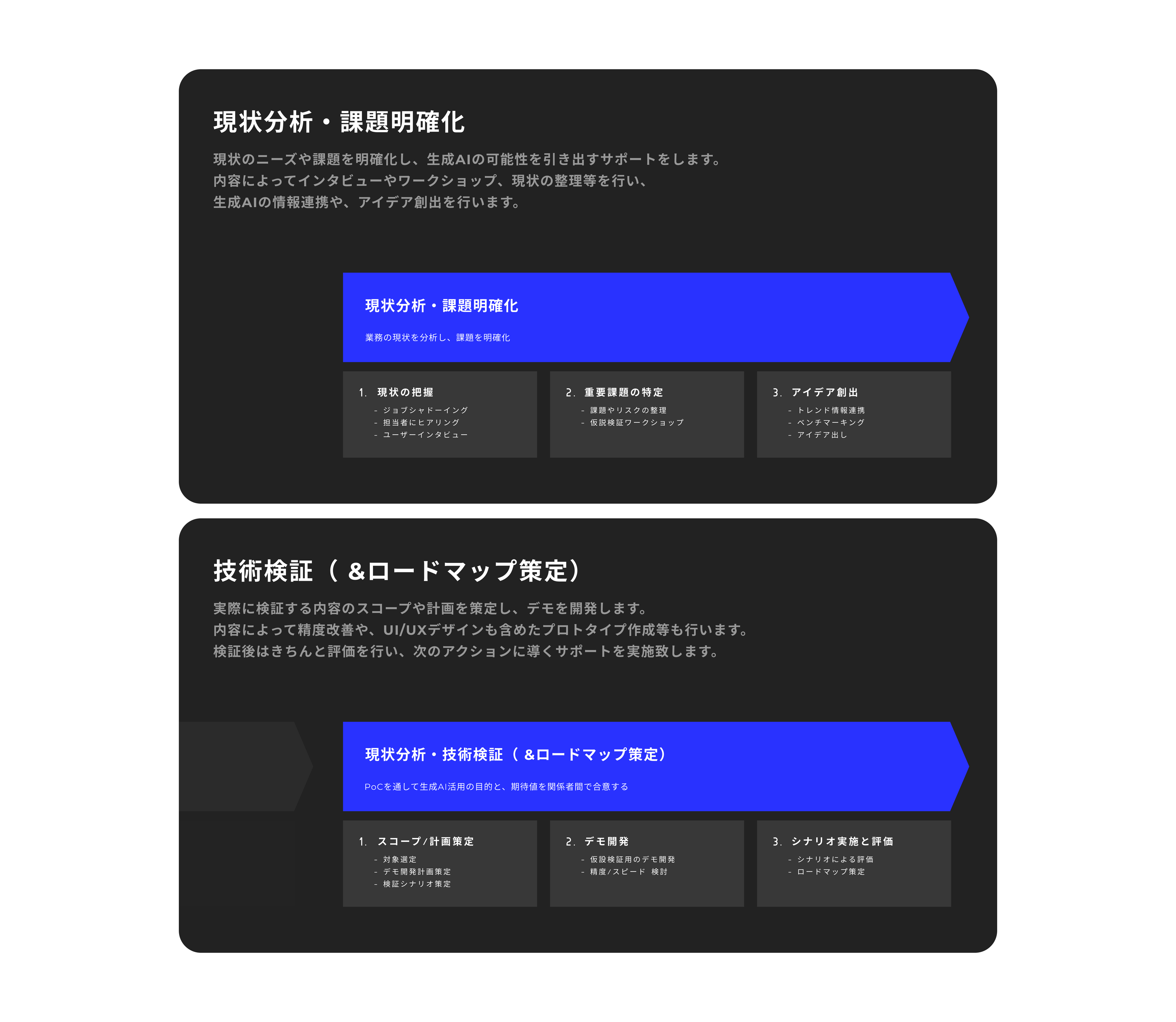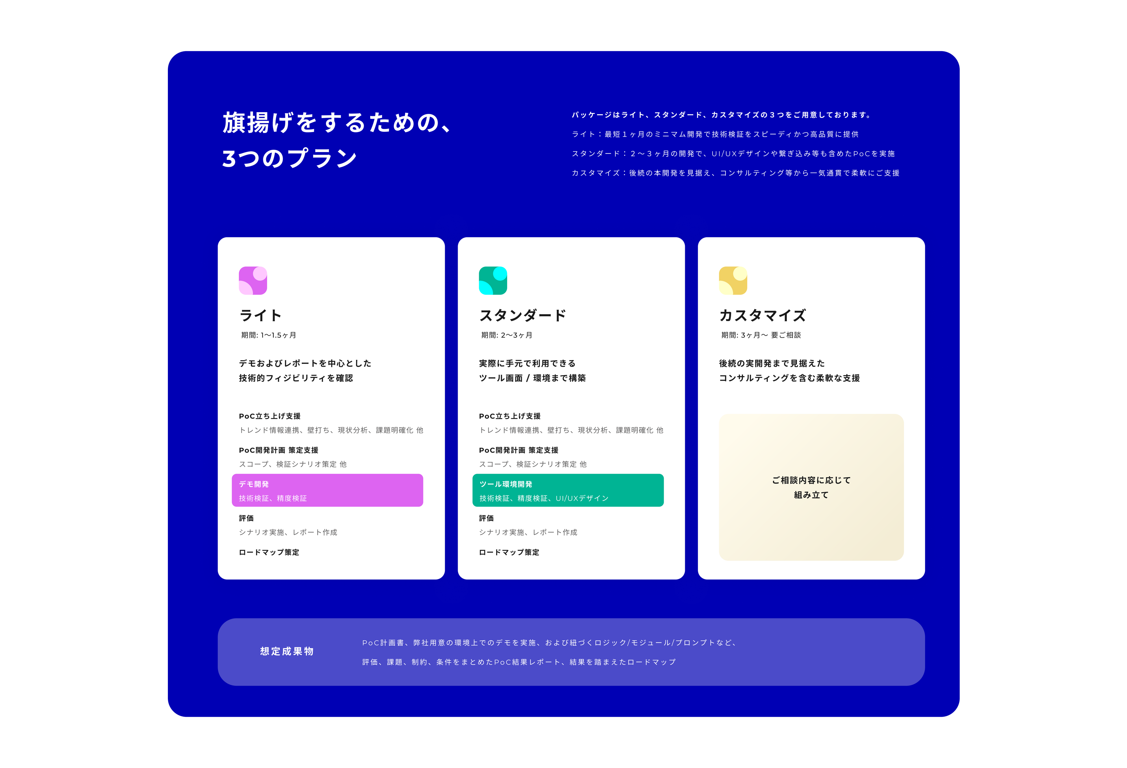 PoCにありがちな「PoCをやって終わり」で実際の実装や導入に伴わないものではなく、PoC終了後の生成AI導入や検討を「前に進める」「次につなげる」パッケージを開発いたしました。