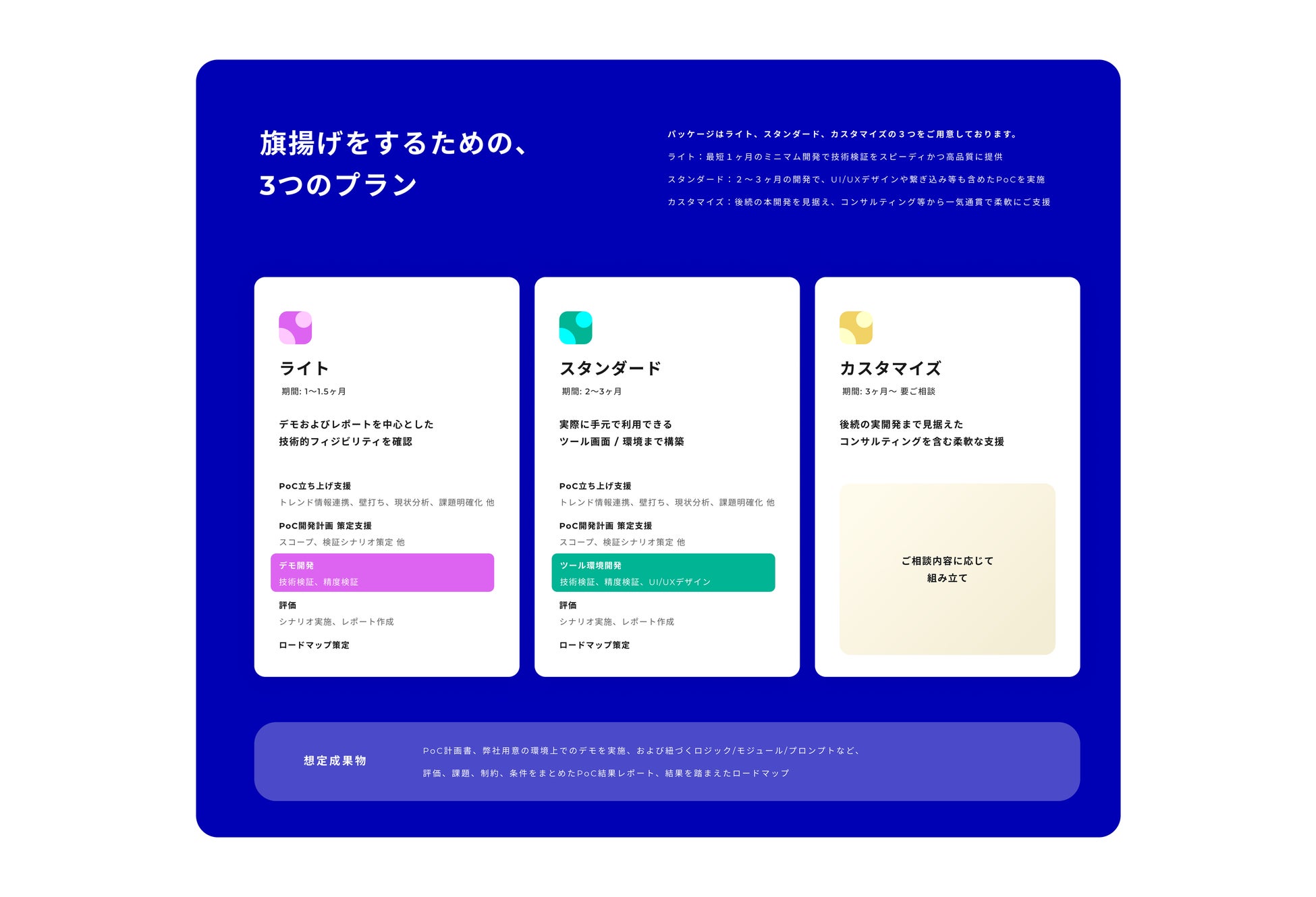 ・スタンダード:システム連携やUI/UXデザインも含め、実際に利用できる画面/環境でご提供します。