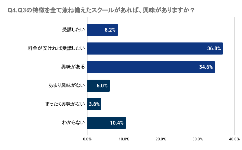 Q4で「Q3の特徴を全て兼ね備えたスクールがあれば、興味がありますか?」と質問したところ、広島県では8.2%が受講を希望し、36.8%は料金が手頃であれば受講したいと考えています。さらに、34.6%は興味を示していると回答しました。多くの人がこのような特徴を持つスクールに一定の興味を示していることが分かります。