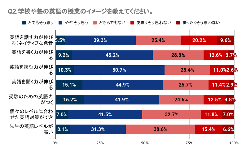Q1・Q2では、子どもが英会話スクールや英語塾に通っていたが英語力アップの効果を感じていない人が一定数いること、学校や塾の英語の授業に対して明確な効果や良い印象を持てていない人が多いことが明らかになりました。