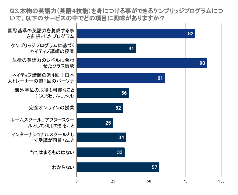 Q3で「本物の英語力(英語4技能)を身につける事ができるケンブリッジプログラムについて、以下のサービスの中でどの項目に興味がありますか?(複数回答可)」と質問したところ、広島県で最も多かったのは「生徒の英語力のレベルに合わせたクラス編成」で90名でした。次いで、「国際基準の英語力を養成する事を前提としたプログラム」には82名、「ネイティブ講師の週4回+日本人トレーナーの週1回のパーソナルトレーニング」には61名が興味を持っています。一方で、「完全オンラインの授業」や「ホームスクール、アフタースクールとして利用できること」に関心を持つ人はやや少なめで、それぞれ32名、25名の回答でした。これらの結果から、多くの人は実用的な英語力の養成や個別のニーズに応じた指導に重きを置いていることが伺えます。