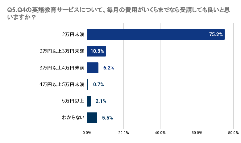 Q4で「受講したい」「料金が安ければ受講したい」「興味がある」と回答した人に、Q5で、「Q4の英語教育サービスについて、毎月の費用がいくらまでなら受講しても良いと思いますか?」と質問したところ、最も多い75.2%の回答者は2万円未満が適切と感じています。10.3%は2万円以上3万円未満、6.2%は3万円以上4万円未満と答えました。対照的に、4万円以上の費用を考える回答者は極少数で、4万円以上5万円未満が0.7%、5万円以上が2.1%でした。これにより、広島県では多くの人が3万円未満の価格帯を望んでいることが明らかとなりました。