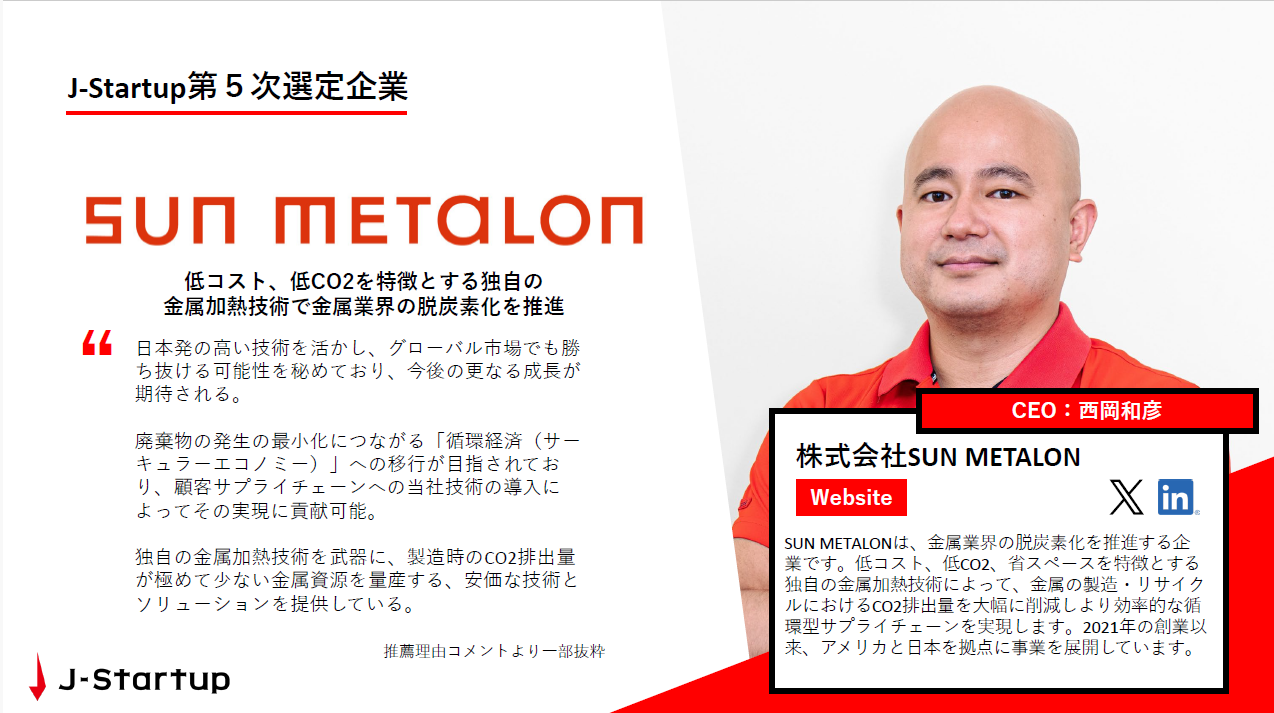 金属業界の脱炭素化を推進する株式会社SUN METALON(以下、SUN METALON)は2025年3月、経済産業省が運営するスタートアップ支援プログラム「J-Startup」の第5次選定企業に選出されたことをお知らせします。日本発の高い技術とグローバル市場で勝ち抜ける可能性が評価されました。