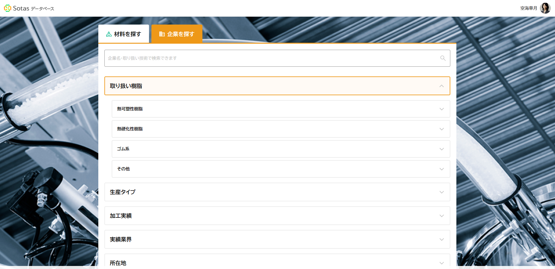 「Sotasデータベース」は2022年12月にプラスチック成形加工企業情報を検索することができるデータベースとしてリリースしました。保有している設備と型締力、クリーンルームの有無、加工実績のある業界、取扱実績のある樹脂などの項目から、目当ての企業を検索することができるデータベースです。