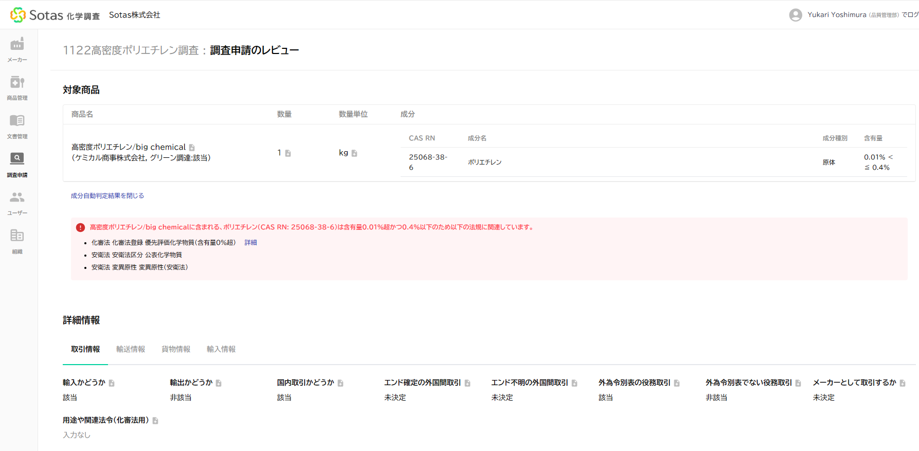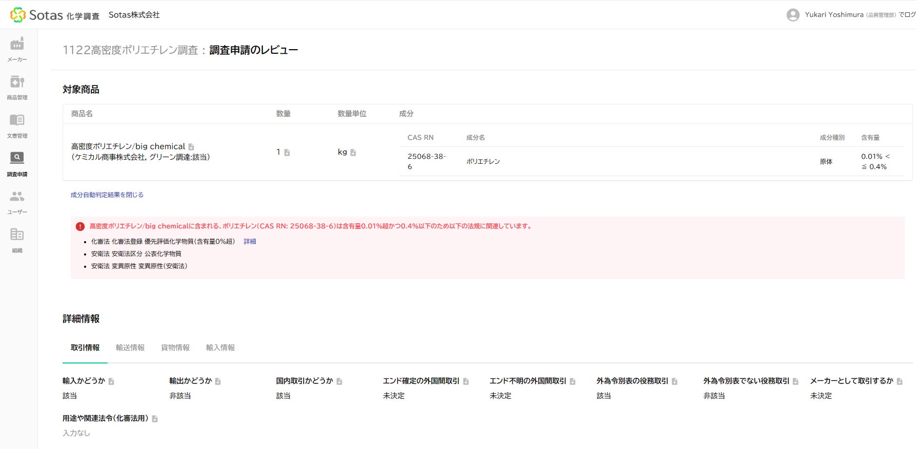 「Sotas化学調査」は、社内の化学調査を簡便にするシステムです。あらかじめ該非判定に必要な物性情報と成分情報を登録しておくことで、調査を依頼する申請者によって、調査対象となる商品の登録時または承認者のレビュー時に自動判定を行い、該当法規に関してアラート表示することで、通知義務の徹底を手助けしてくれます。