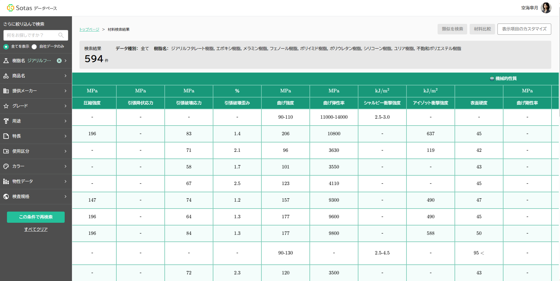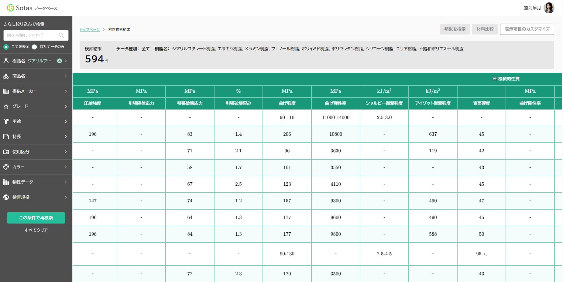 今回のアップデートでは、企業情報に加え、約8,000件の汎用の樹脂情報をSotasデータベースにて検索することができます。8,000件の樹脂情報は、樹脂名・使用区分・グレード・カラーなどの基本情報に加え、物性データ・用途・特長からも検索することができるほか、類似の樹脂を検索する機能を搭載しています。
