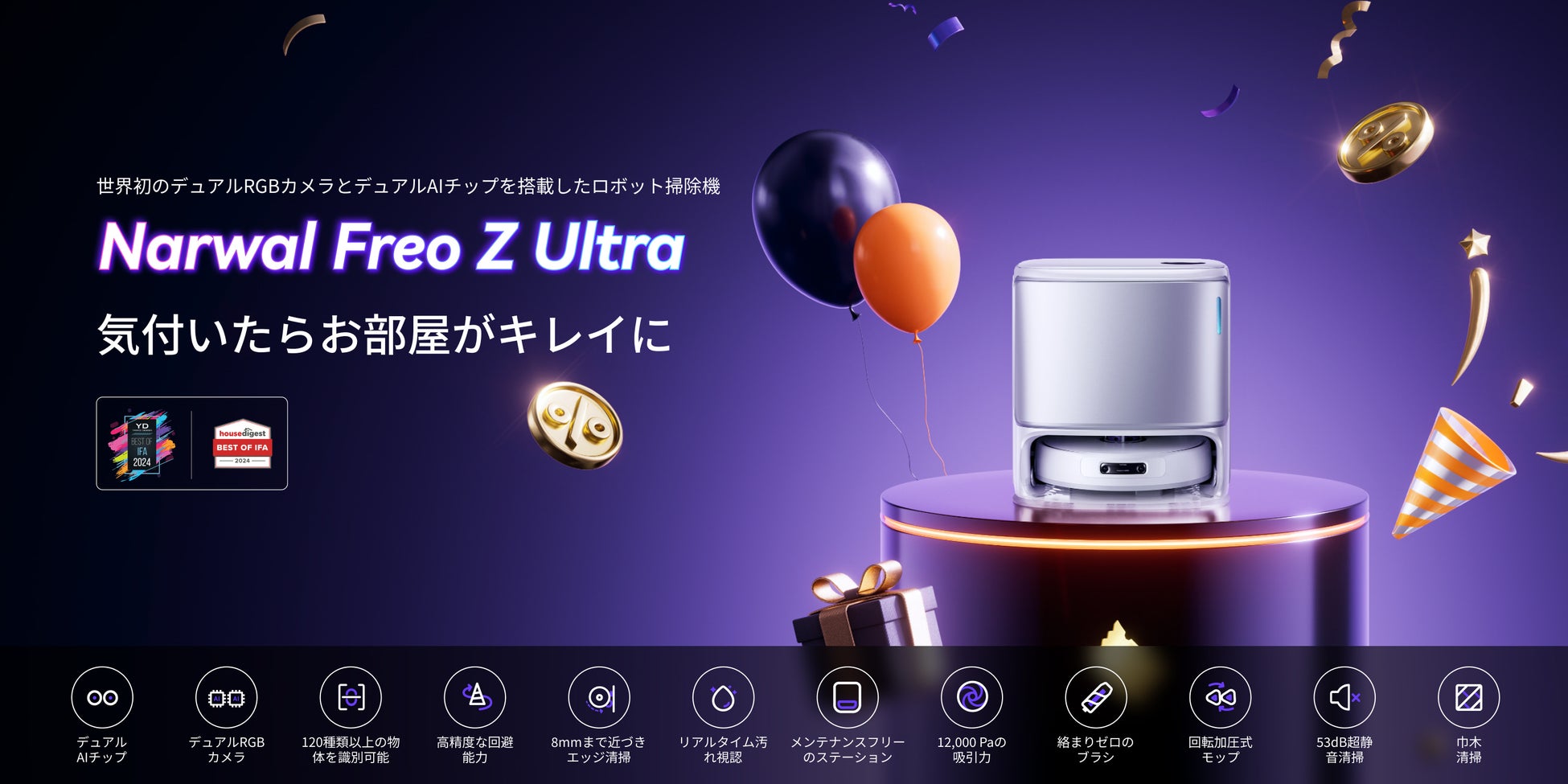 Narwalの最新フラッグシップモデル「Freo Z Ultra」は、次世代技術を駆使し、清掃精度と効率を大幅に向上させました。世界初のデュアルRGBカメラにより、あらゆる障害物を目視可能。狭いスペースはもちろんのこと、もはや事前の部屋の片付けすら不要となった、最も進化したロボット掃除機です。
