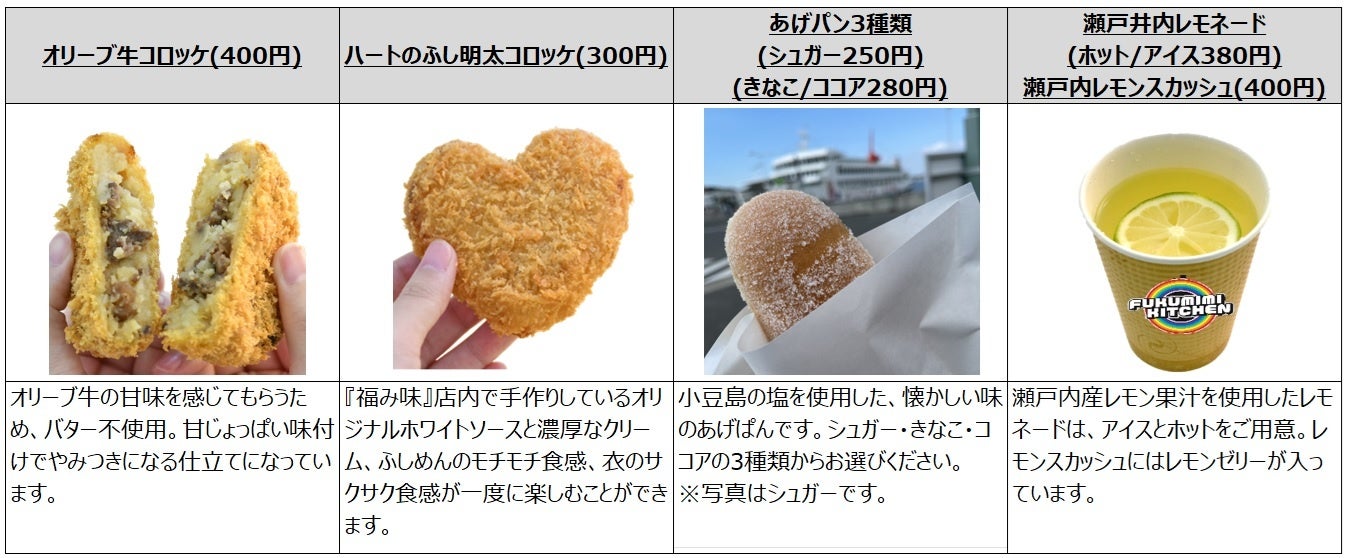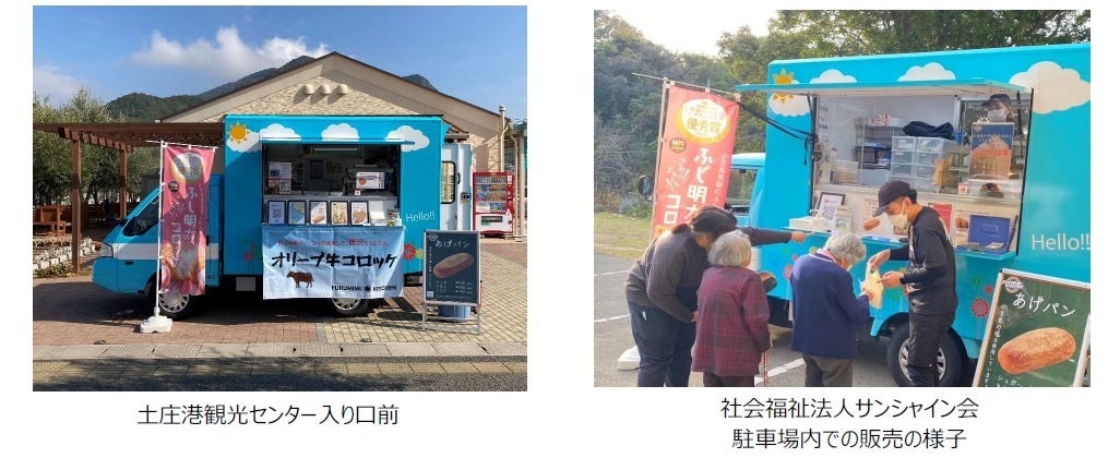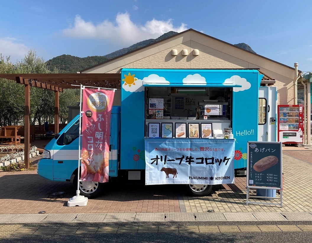 香川県小豆島で一般の方向けのお弁当・惣菜を販売する『福み味』(土庄町渕崎甲2663-3)は、「観光客や島内の方々に、瀬戸内や香川県、小豆島ならではの食材を知ってもらいたい」、「小豆島の活性化に貢献したい」という想いのもと、11月8日(火)よりキッチンカー『FUKUMIMI KITCHEN』を開始しました。土庄港観光センターの支配人から、「土庄港を活気づけてほしい」との依頼をいただいたことを受け、土庄港観光センター入り口前で販売を行っています(不定期)。また、毎週木曜日には社会福祉法人サンシャイン会の施設駐車場内で、施設ご利用者様向けにも販売しています。メニューには、小豆島の塩を使用したあげパンや、土庄港観光センターで「オリーブ牛はどこで食べられるの?」といった質問が多いことがきっかけで考案されたオリーブ牛コロッケ、瀬戸内産のレモンを使用したレモネードやレモンスカッシュなど、地産地消をテーマにした商品が並びます。また、小豆島特産物のそうめんの「ふしめん」※1を使用し、2022年2月の「惣菜・べんとうグランプリ」(日本食糧新聞社主催)で優秀賞を受賞した、ふし明太コロッケもキッチンカーで販売されます。小豆島や豊島のイベントにも出店しており、12月21 日(水)には、小豆島の西光寺の門前通りで開催される「霜月大師市」※2に出店。観光客や島内の多くの方々にご当地商品やコロッケなどを楽しんでいただくことで、小豆島の活性化に寄与したいと考えています。2023年からは、スーパーのマルヨシセンター(土庄店・内海店)駐車場内でも出店を行う予定です。今後も地産地消商品の開発やイベント、さまざまな拠点での出店を増やし、観光客や島内の方々との交流を通して、地域活性化に貢献してまいります。