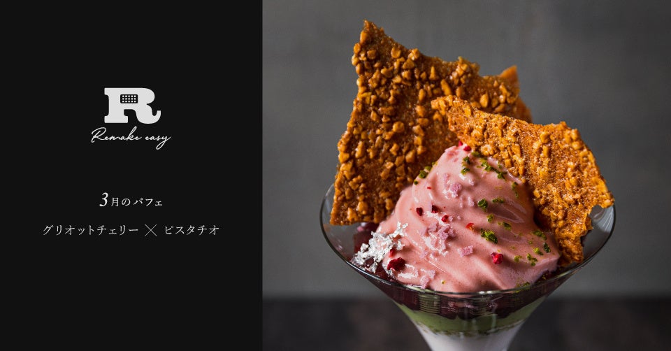 Remake easy株式会社が運営する、限られた人しか食べることができない特別なパフェと、パフェにペアリングしたカクテルを提供する会員制パフェバー「Remake easy」(リメイクイージー)から期間限定パフェ「サクラグリオットピスターシュパフェ」が2023年3月1日(水)から3月31日(金)まで登場します。
