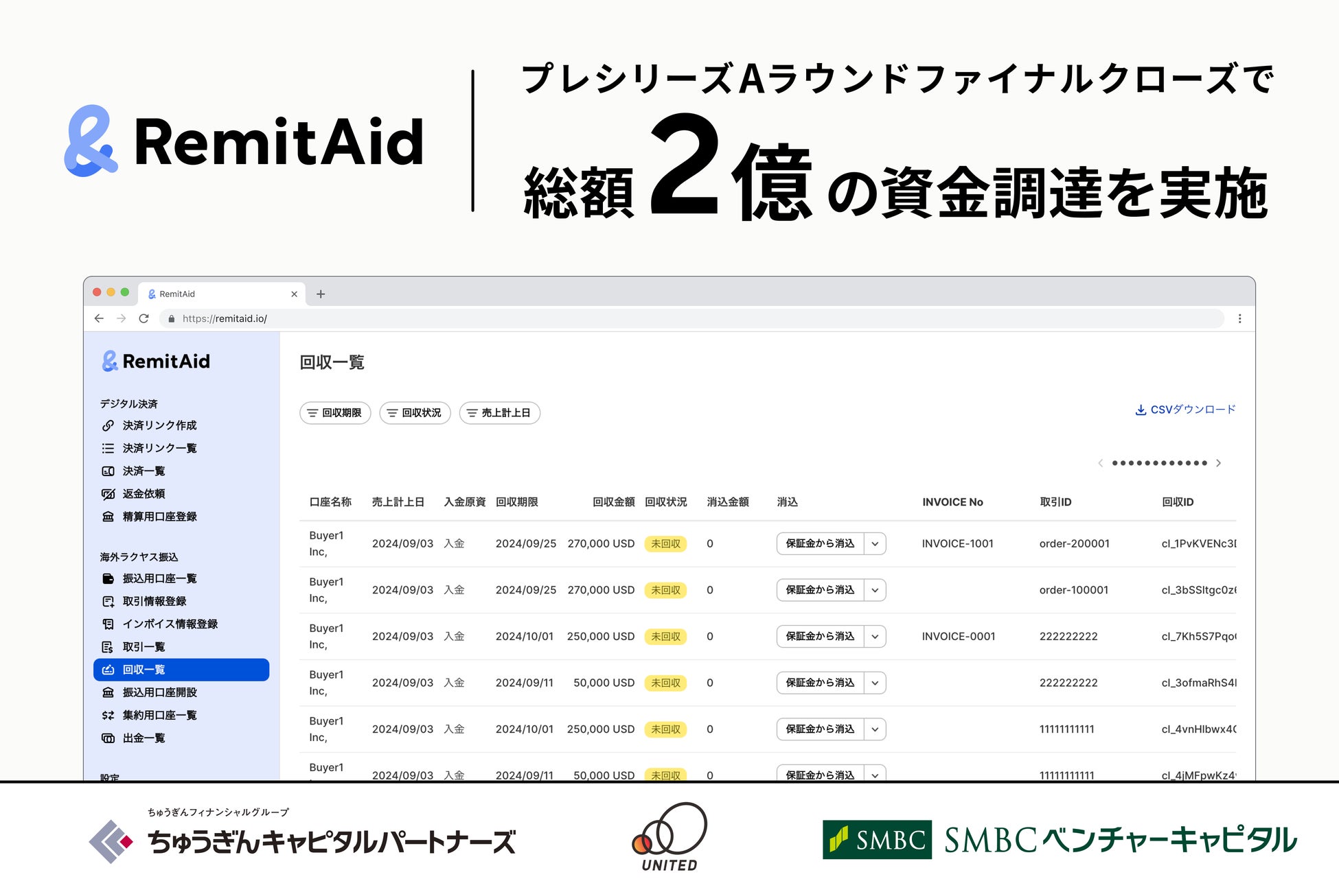「世界に挑む日本を支える」をビジョンに掲げ、海外企業との取引を簡単にするグローバルマルチ決済プラットフォーム「RemitAid(レミットエイド)」 (https://remitaid.io/) を提供する株式会社RemitAid(本社:東京都渋谷区、代表取締役:小川裕大、以下当社)は、この度、ユナイテッド株式会社、株式会社ちゅうぎんキャピタルパートナーズ、SMBCベンチャーキャピタル株式会社により、プレシリーズAラウンドのセカンドクローズにて5,500万円の資金調達をいたしました。先日実施しましたファーストクローズと合わせ、プレシリーズAラウンドでの資金調達は総額2億円となり、本ラウンドをクローズしております。 RemitAidのビジョンである、「お金の国境を無くす」の実現に向け事業成長を加速して参ります。
