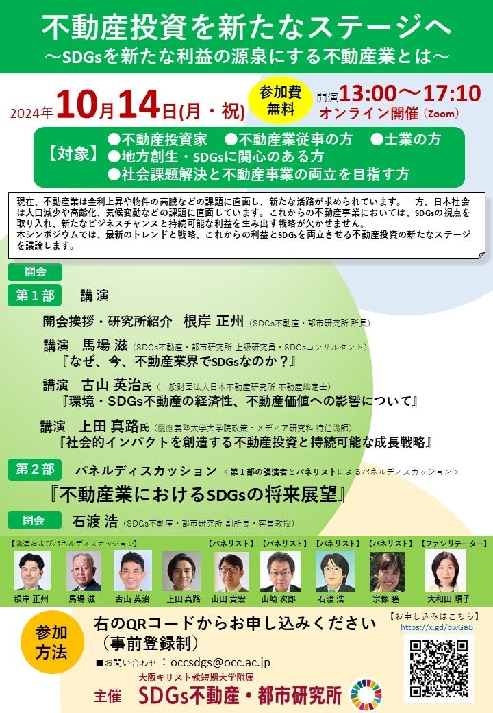 大阪キリスト教短期大学付属 SDGs不動産・都市研究所(所在地:東京都新宿区西新宿7丁目1−12クロスオフィス新宿407 学校法人OCC内/所長:根岸正州、以下SDGs不動産・都市研究所)は、2024年10月14日(月・祝)13:00よりオンラインにて「SDGs不動産・都市研究所シンポジウム」を開催します。