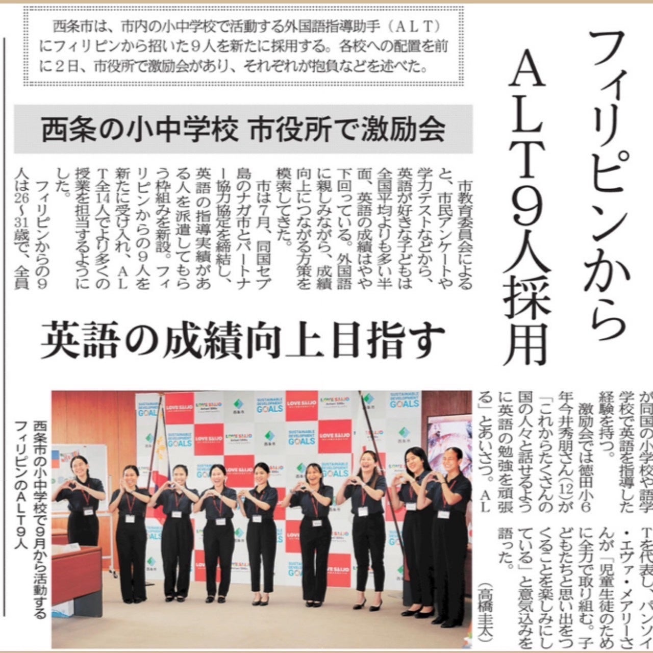 2024年9月から、愛媛県初となる西条市の小中学校に9名のフィリピン人英語講師の派遣が開始されました。