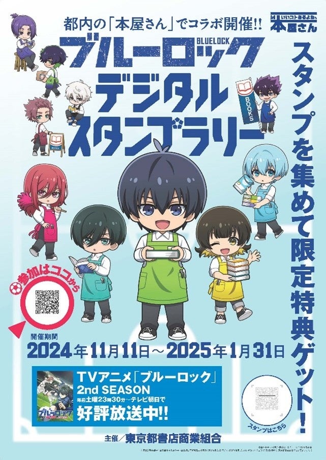キャンペーンの第1弾として、TVアニメ「ブルーロック」とコラボしたデジタルスタンプラリーを2024年11月11日(月)より、東京都内189の書店で開催します。店頭に掲示されたイベント告知ポスターが目印で、参加店舗でスタンプをひとつ以上獲得すれば、いつでも好きな場所で撮影できるARキャラクターなど、うれしいイベント限定特典がもらえます。本屋での新たな発見と、書店員に扮した「ブルーロック」のキャラクター10人との出会いをぜひお楽しみください。