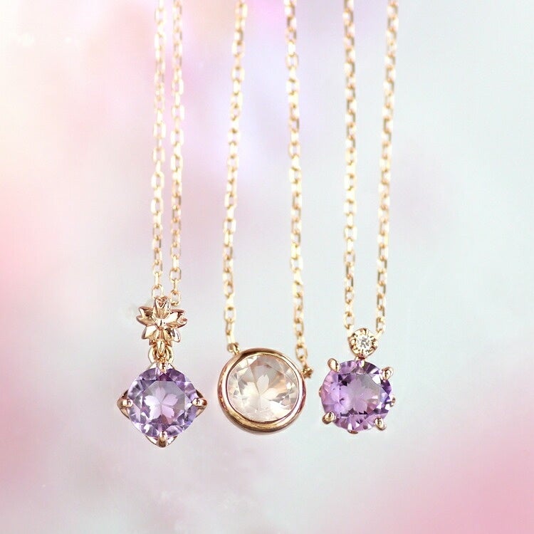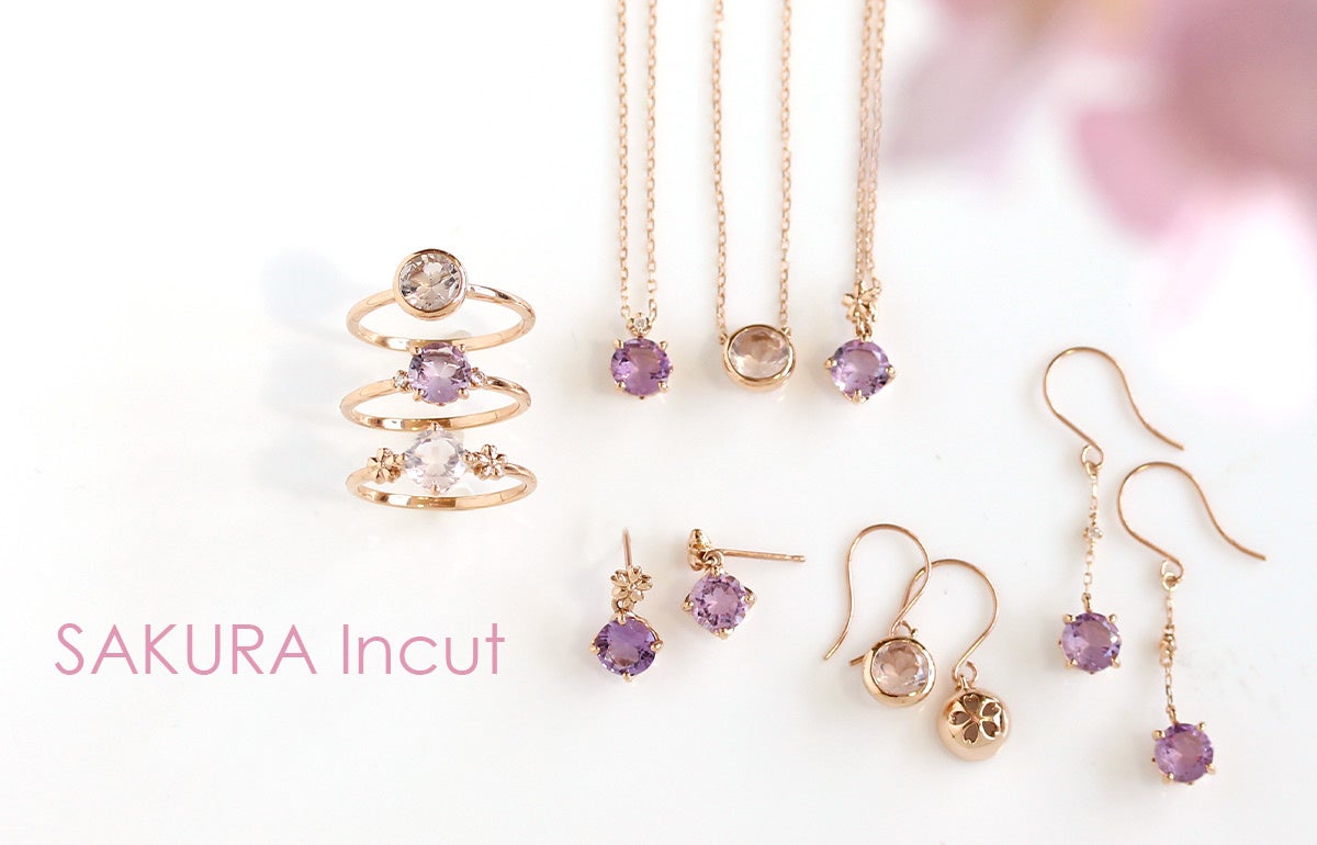 覗き込むとジュエルの中に可憐な桜が浮かび上がる・・”さくらインカット”のローズクォーツ・ローズアメジストをあしらった、とっておきの桜ジュエリー。