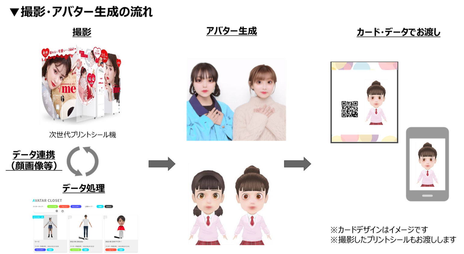 本プリ機には、5GやXRなどの技術・サービスの発展にともない、今後SNSもメタバースへ移行していくことを見据え、アバター生成機能を搭載しています。Z世代に人気が高く日常的にお楽しみいただけるプリントシール機で、より身近な”メタバース体験”をお届けします。また、思い出の瞬間を「リアル」なシールとして残すだけでなく、作成したアバターを使って「バーチャル」なメタバース空間で交流するといった新たな楽しみ方を提案します。