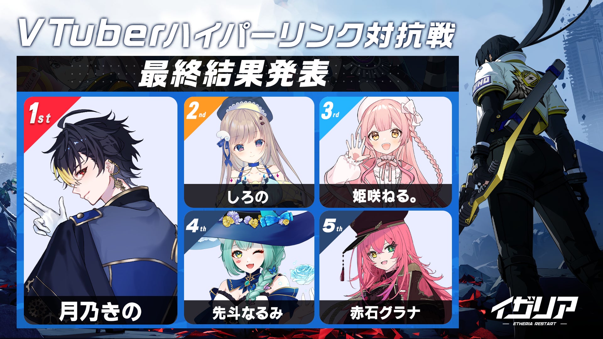 8月28日に開幕した「イザリアVTuberハイパーリンク対抗戦」は、9月8日に堂々のフィナーレを迎え、ついに最終結果が発表されました。熾烈な争いを制した月乃きのさんが見事優勝に輝き、続いてしろのさんが2位、姫咲ねる。さんが3位にランクイン。さらに先斗なるみさんが4位、赤石グラナさんが5位と続き、最後まで目が離せない熱戦となりました。
