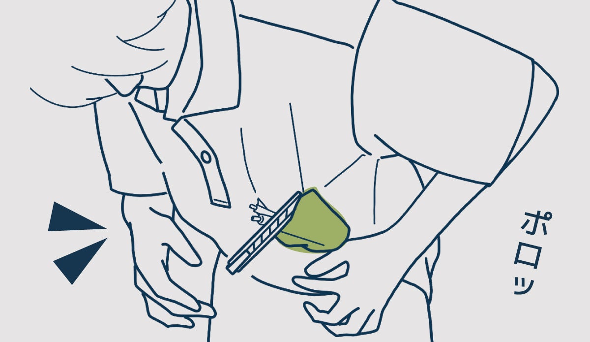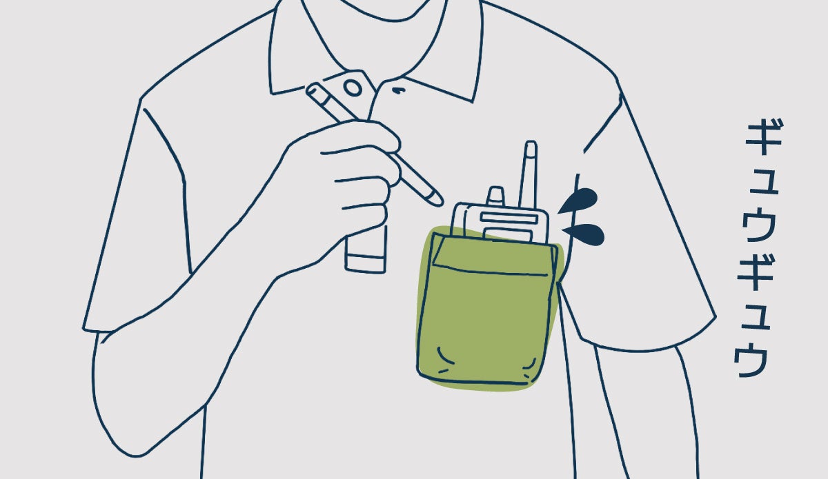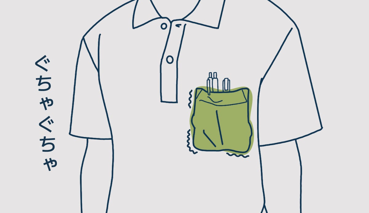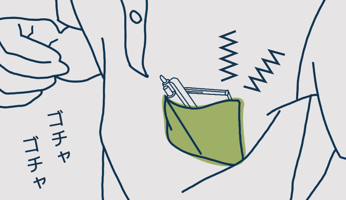 職場を見渡すと、スーツやシャツ、ポロシャツの胸ポケットにスマホやメモ、名刺や小銭、IC カード、電子タバコなど十人十色で様々な物が入れられていることに私達は気づきました。これら複数の物が入った胸ポケットは、「何かを取り出そうとすると別の物が出てくる」、「前かがみになるとスマホや筆記具が落ちる」などビジネスシーンで頻繁に起きる問題があることに私達は気づきました。