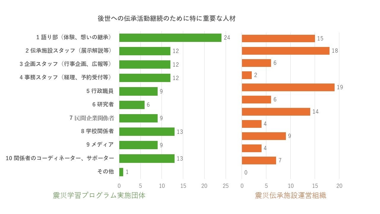 活動継続に最も重要な人材を、伝承団体は「語り部」、伝承施設は「行政職員」と回答していた。語り部は伝承施設においても重要とされていた一方で、「伝承施設スタッフ」、「事務スタッフ」、「民間企業関係者」については団体と施設の立場によって回答に差異が見られた。