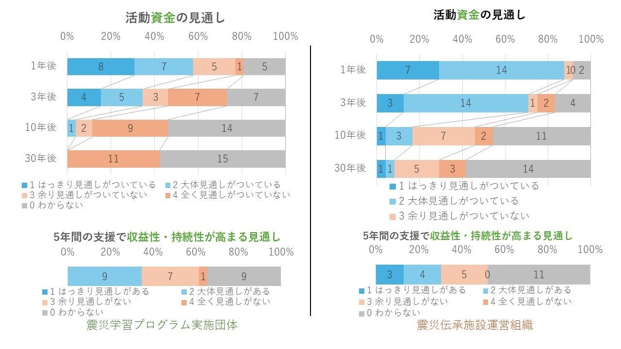震災学習プログラム実施団体(以下、伝承団体)、震災伝承施設運営組織(以下、伝承施設)の財源不足はこれまでの調査でも課題であったが、本調査にて1年後、3年後、10年後、30年後と区切って質問することで、年月を増すにつれて見通しがつかなくなる現状が明らかとなった。